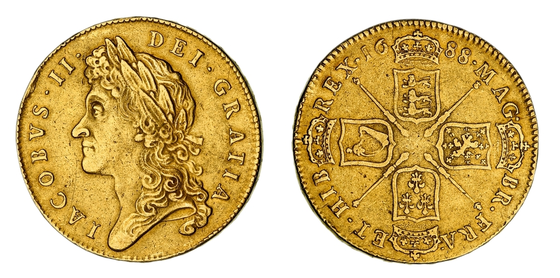 (x) James II (1685-1688), Five-Guineas, 1688 QVARTO, first laureate bust left, rev. crowned shields cruciform, emblem-adorned sceptres in angles, eleven strings to harp, raised letters | •+• DECVS • ET • TVTAMEN • | • ANNO • REGNI • QVARTO •+• downwards on edge, 41.426g [639.30grns], 7h (MCE 119; EGC I, 316; Stratos - [cf. 189]; S.3397), small rim bruise at 10 o'clock, the hair craftily and convincingly re-worked in antiquity, otherwise struck details fine to very fine