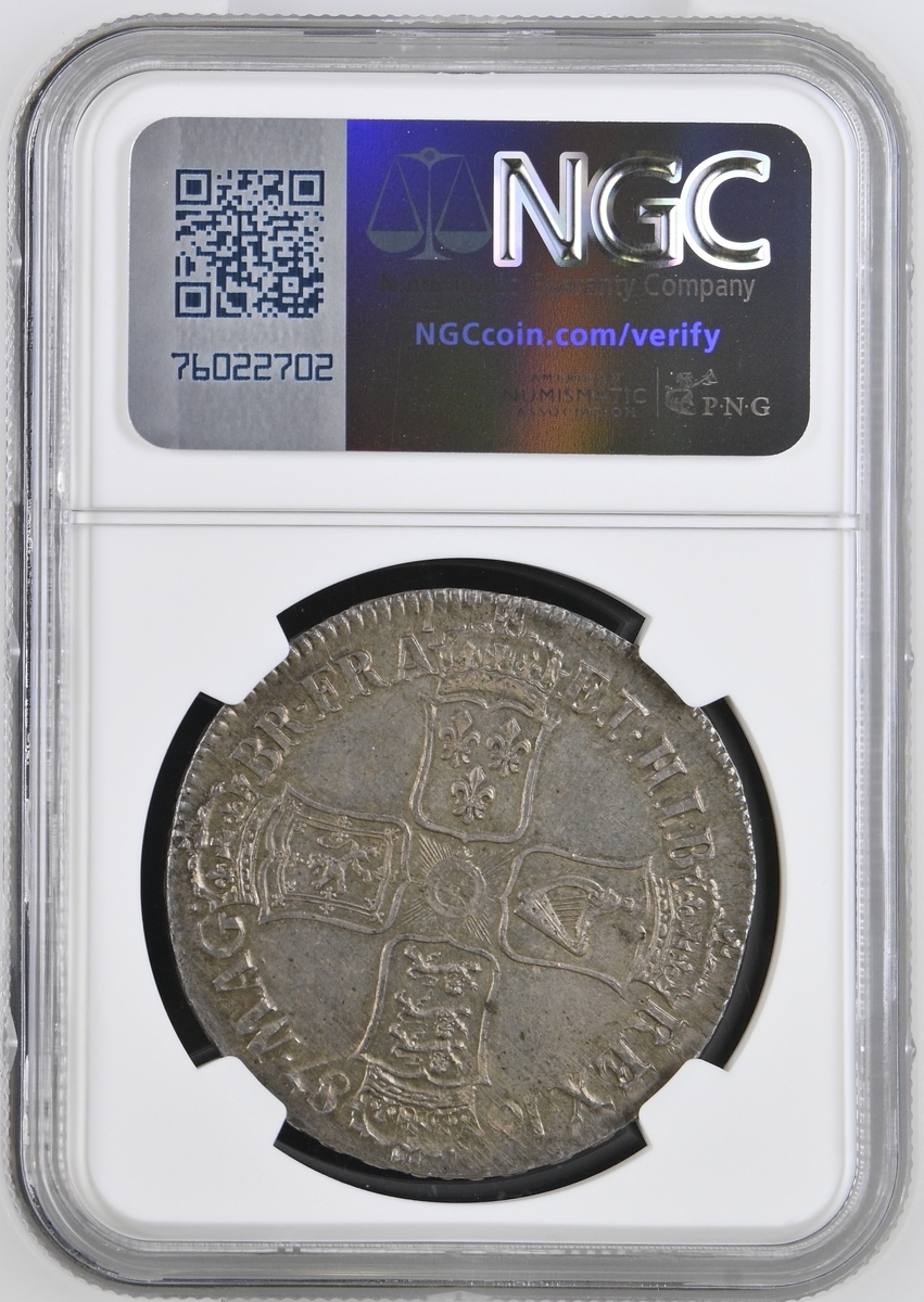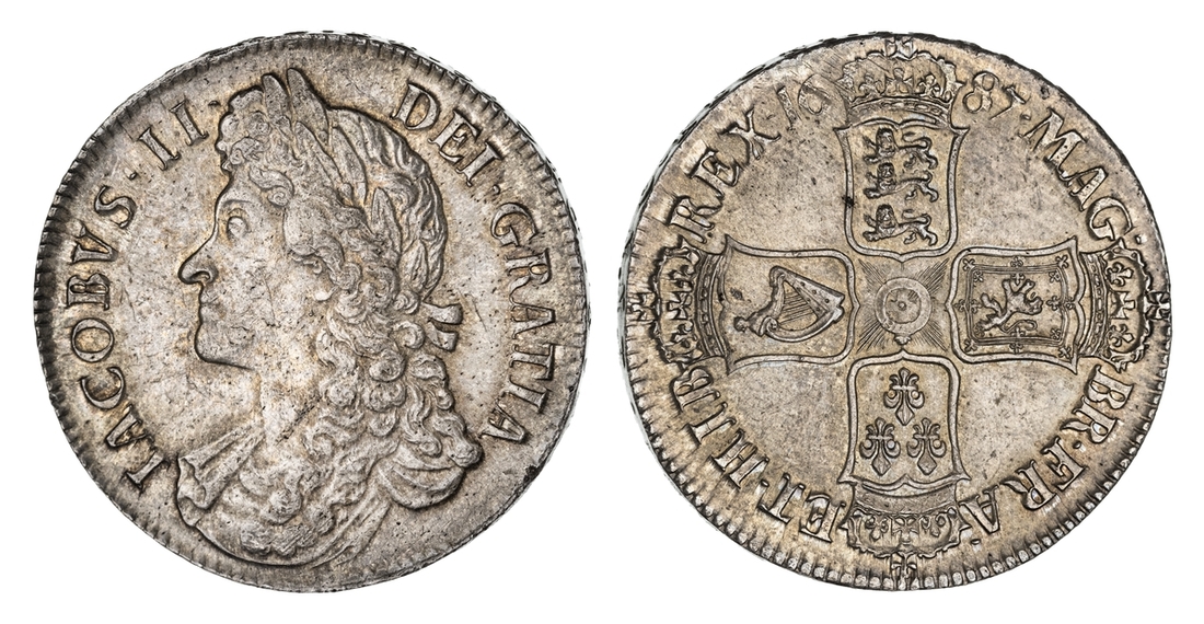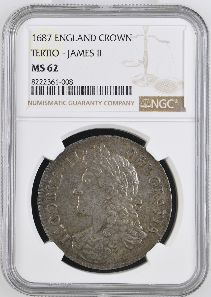 NGC MS62 | James II (1685-1688), Crown, 1687 TERTIO, second laureate and draped bust left, rev. four crowned shields cruciform, six strings to harp, upwards large lettered edge, 29.22g [450.93grns], 6h (ESC 79; Bull 745; S.3407), a few light surface scuffs and friction to the reverse, and pinmarks, but otherwise lightly toned, extremely fine, in NGC holder, graded MS62 (Cert. #8222361-008)