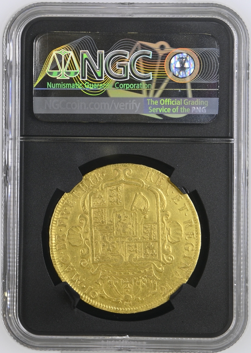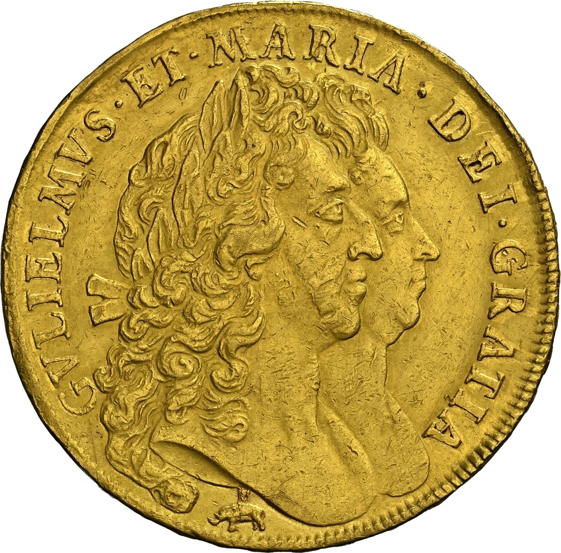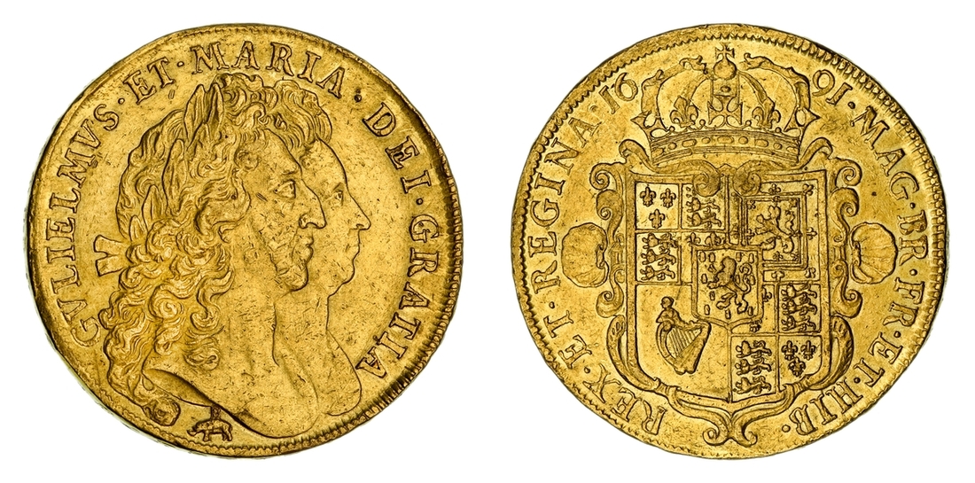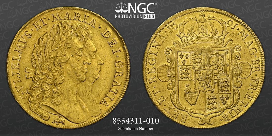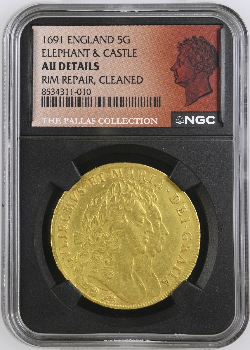 (x) NGC AU | William and Mary (1688-1694), 'Royal African Company', Five-Guineas, 1691 TERTIO, Elephant and Castle, conjoined laureate busts right, E&C below, rev. crowned and garnished shield, 41.689g [643.36grns], 6h (King - [cf. 124-125 for date]; MCE 137; EGC I, 345; GH 48; S.3423), a minor rim bruise at 11 o'clock, and the fields lightly wiped but with much residual lustre, an attractive and really bold very fine, the variety unrepresented in the famous Samuel King collection, scarce thus, in NGC Black 'Pallas' holder, graded Almost Uncirculated (Cert. #8534311-010)