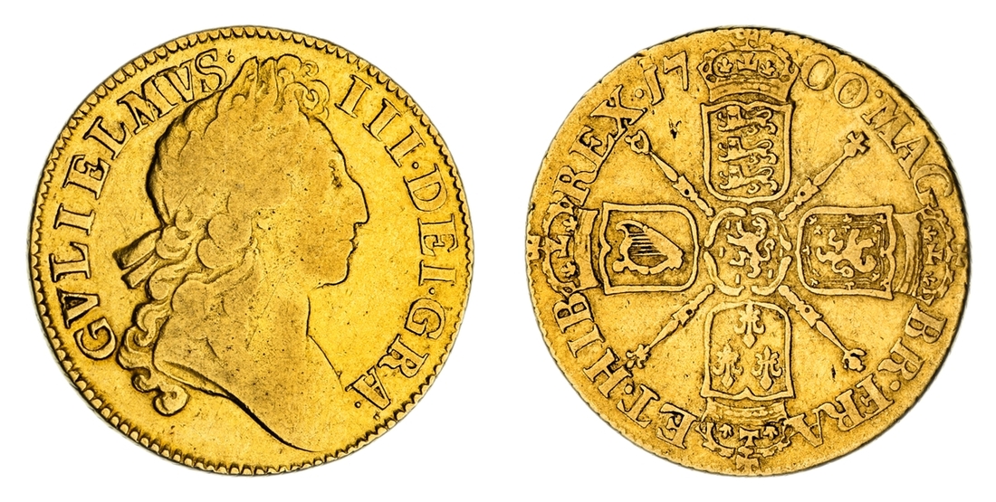 (x) William III, Solus (1694-1702), Guinea, 1700, second laureate head right, rev. six strings to late harp, semi-ornate emblem-adorned sceptres in angles, edge obliquely milled, edge obliquely milled, 8.24g, 5h (MCE 184; Farey 430; EGC I, 423 [Type C/13]; S.3460), fine / very fine