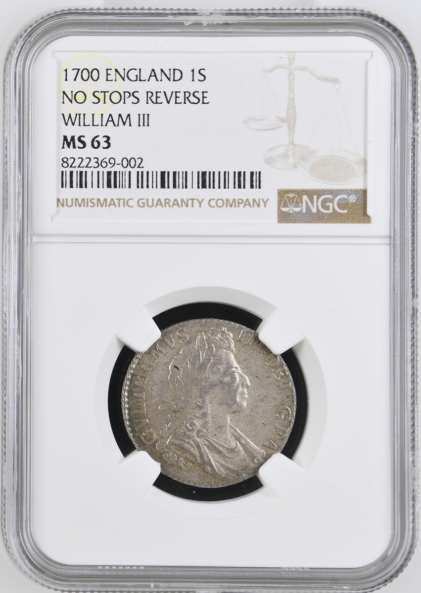 NGC MS63 | *Top Pop* | William III, Solus (1694-1702), Shilling, 1700, fifth laureate bust, rev. crowned cruciform shields, no stops, 5.98g, 5h (ESC 1121; Bull 1150; S.3516), some slight rub to the higher points of the obverse but otherwise practically uncirculated, cartwheel lustre remains, near extremely fine, in NGC holder, graded MS63 *Top Pop* (Cert. #8222369-002) [*Single Finest Certified*]