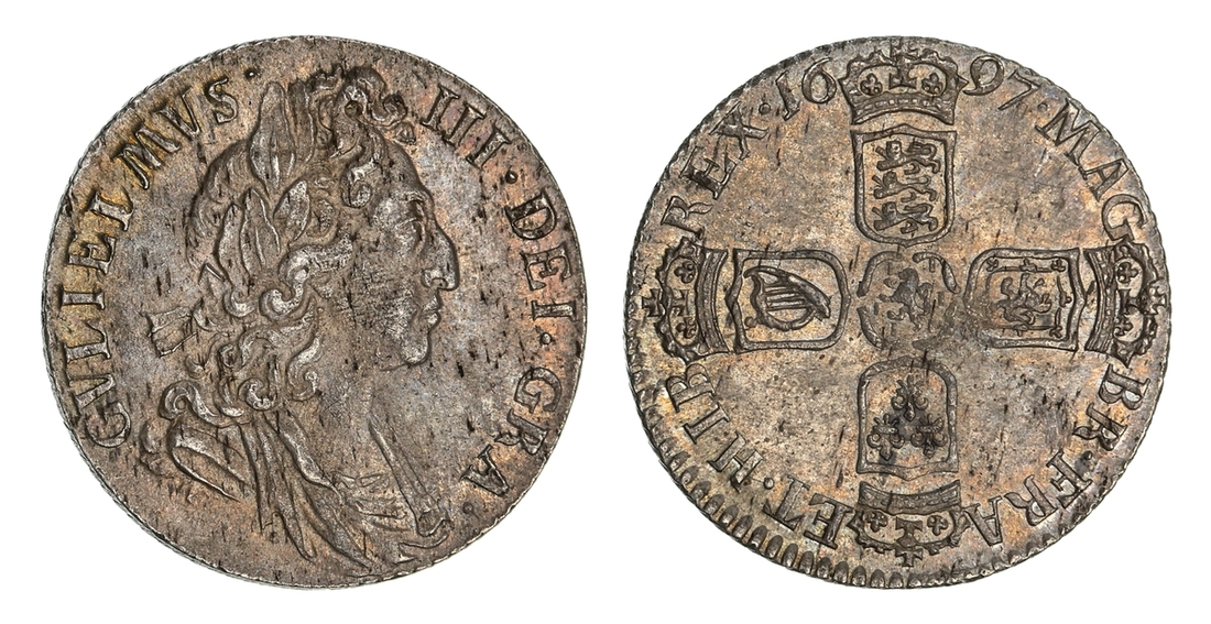 (x) NGC MS62 | William III, Solus (1694-1702), Sixpence, 1697, third laureate and draped bust right, rev. crowned cruciform shields, four strings to late harp, large crowns, edge obliquely milled, 2.85g, 6h (ESC 1566; Bull 1233; S.3538), light flecking, with a pleasing cabinet tone to lustrous surfaces, good extremely fine, in NGC holder, graded MS62 (Cert. #8534309-002)