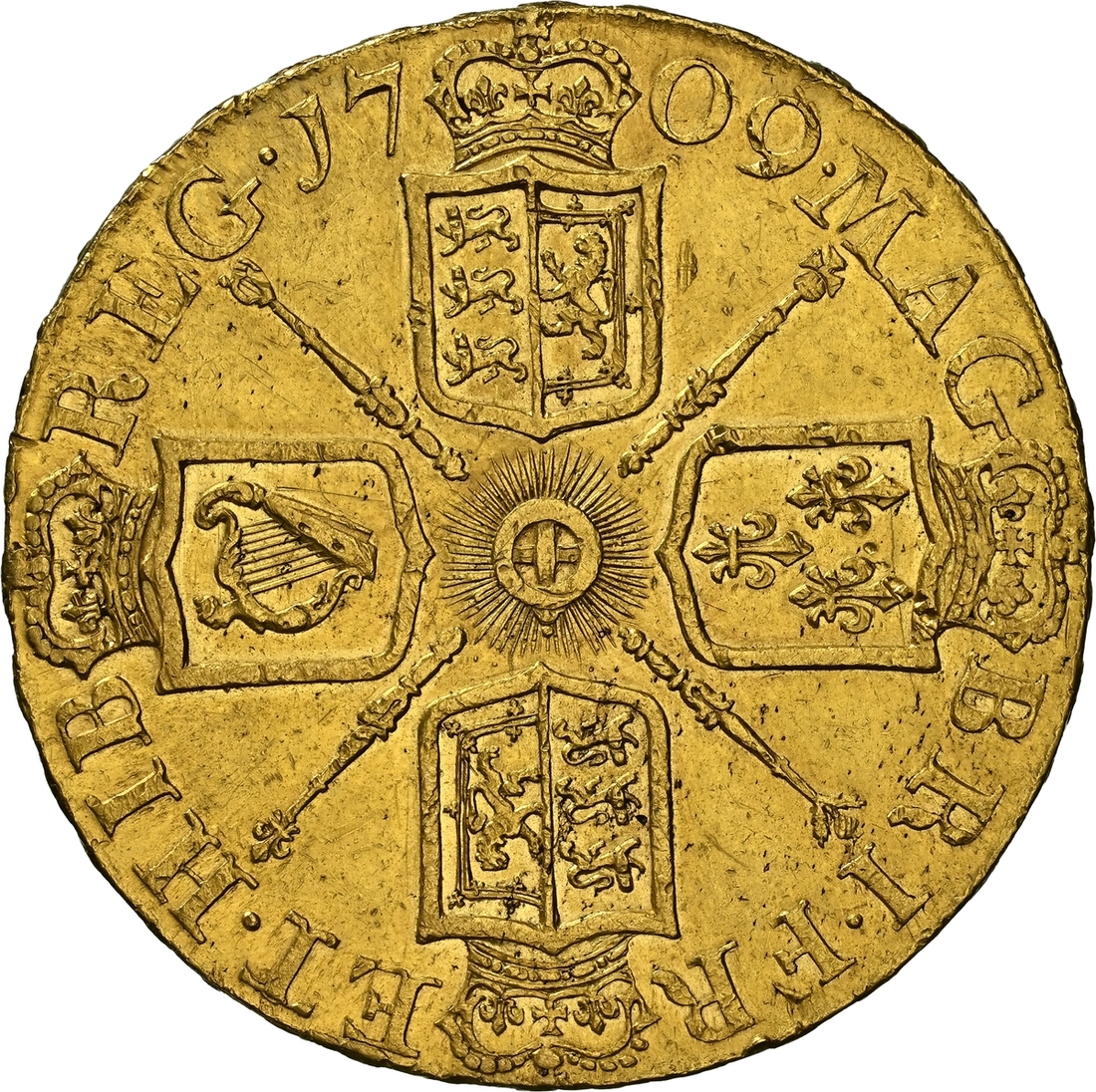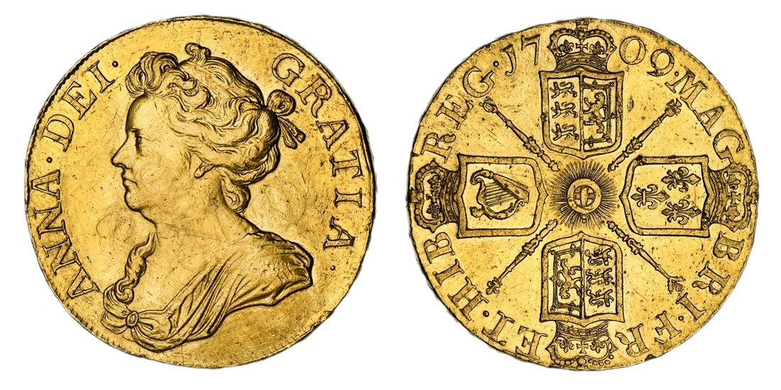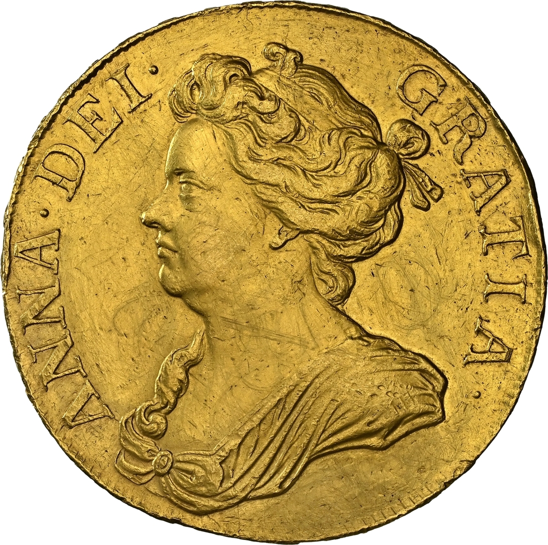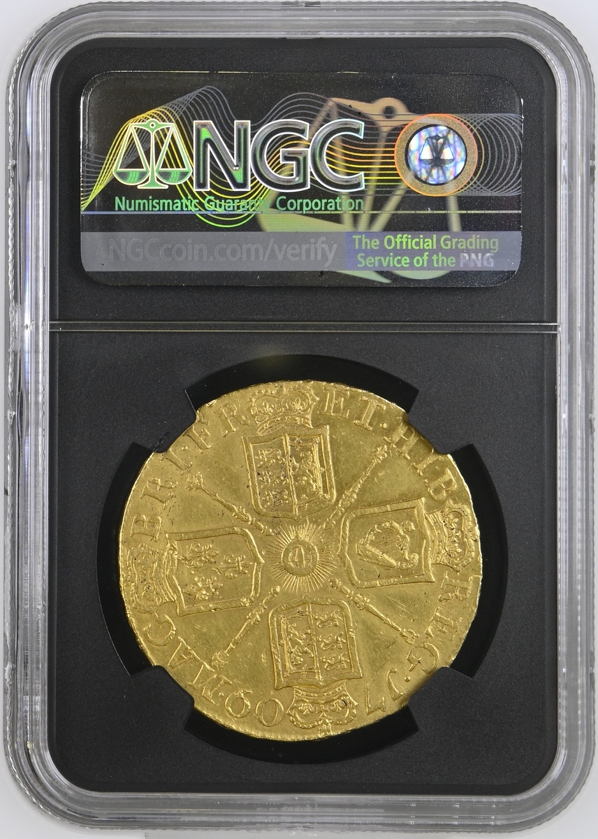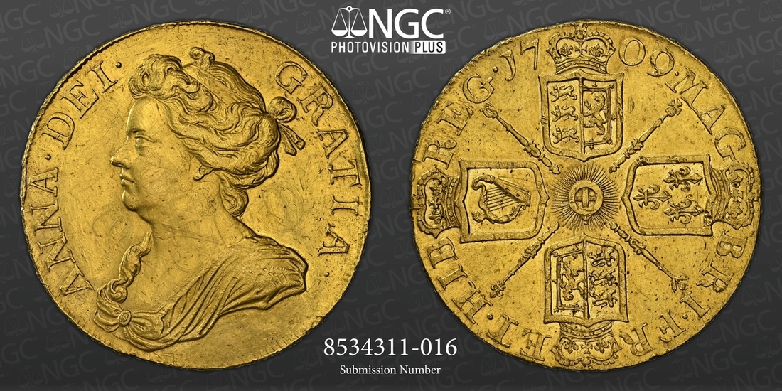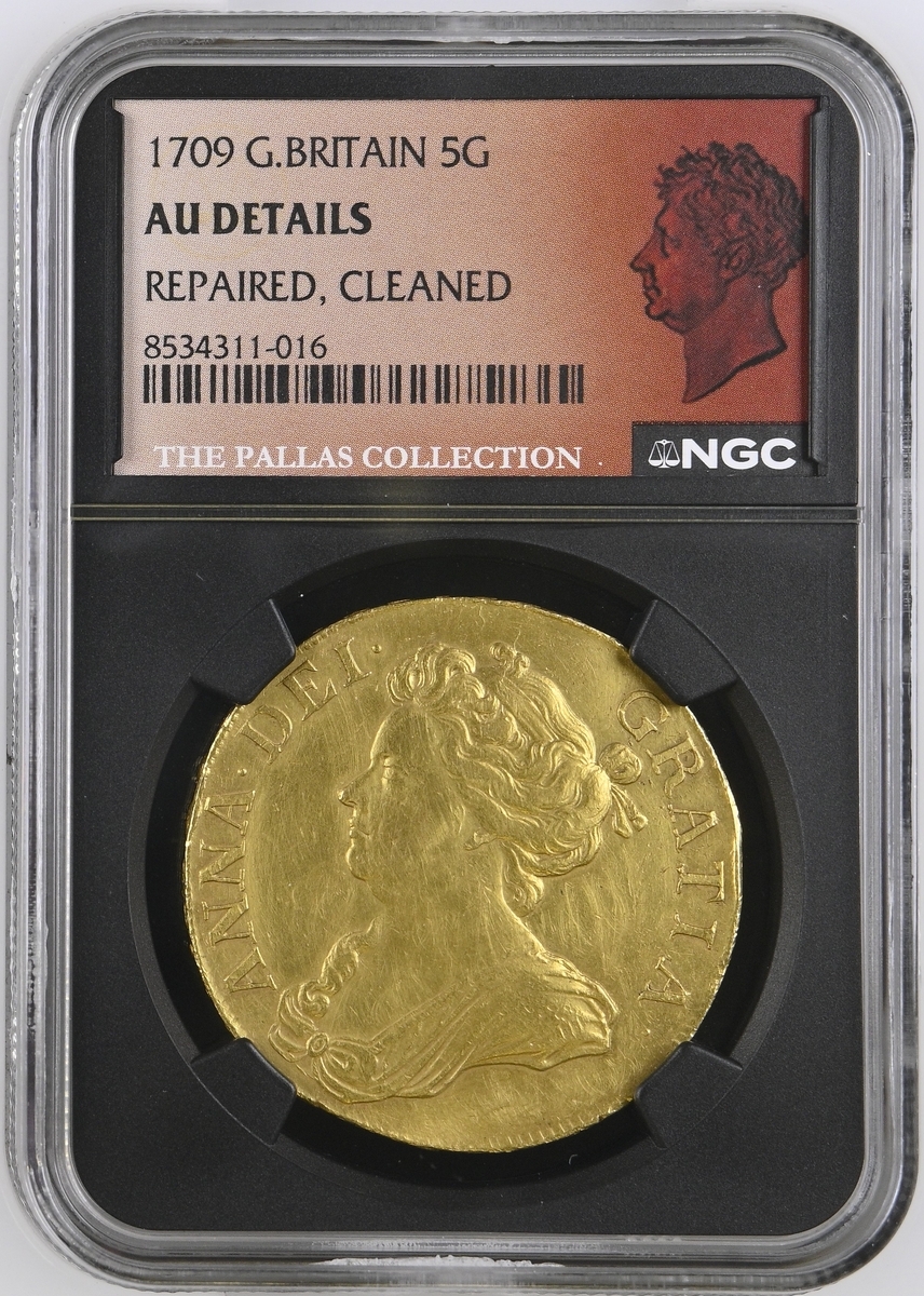 (x) NGC AU | Anne (1702-1714), Post-Union, Five-Guineas, 1709 OCTAVO, first diademed and draped bust left, rev. crowned broader shields cruciform, emblem-adorned sceptres in angles, six strings to harp, raised letters + • DECVS • ET • TVTAMEN • • ANNO • REGNI • OCTAVO • upwards on edge, 41.735g [644.07grns], 6h (King 146; MCE 201; EGC I, 450; GH 70; S.3567), the fields smoothed where formerly graffitied on obverse, and with a small bruise to obverse 3 o'clock, otherwise with much natural lustre and an honest uniform strike, a bolder very fine / extremely fine but with some unfortunate dragmarks across French shield, in NGC Black 'Pallas' holder, graded Almost Uncirculated (Cert. #8534311-016)