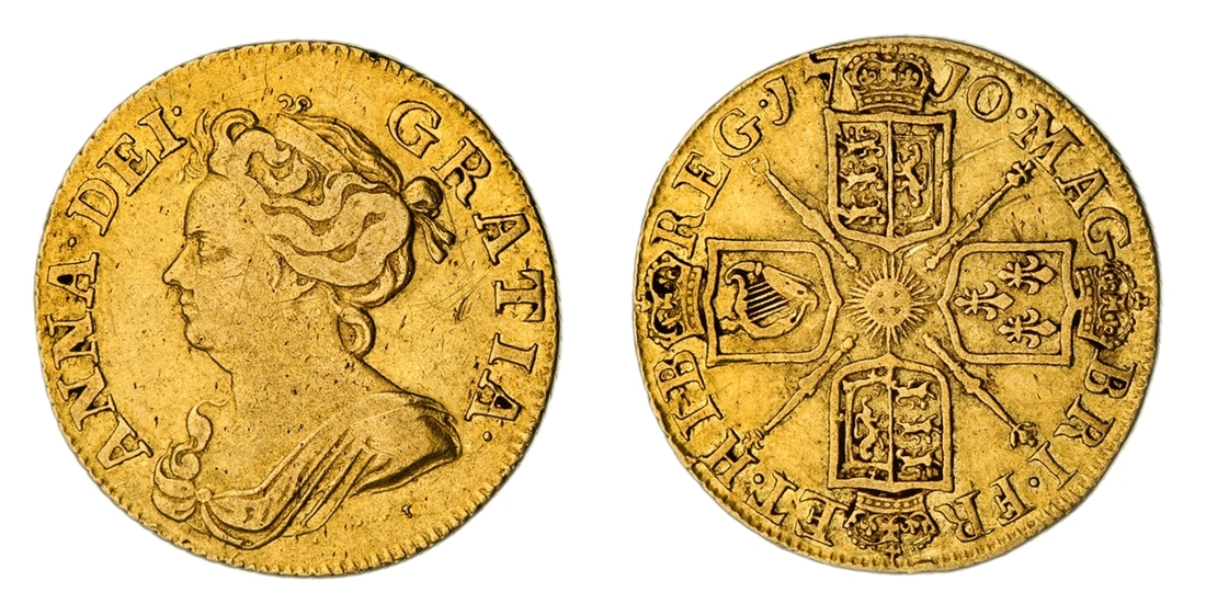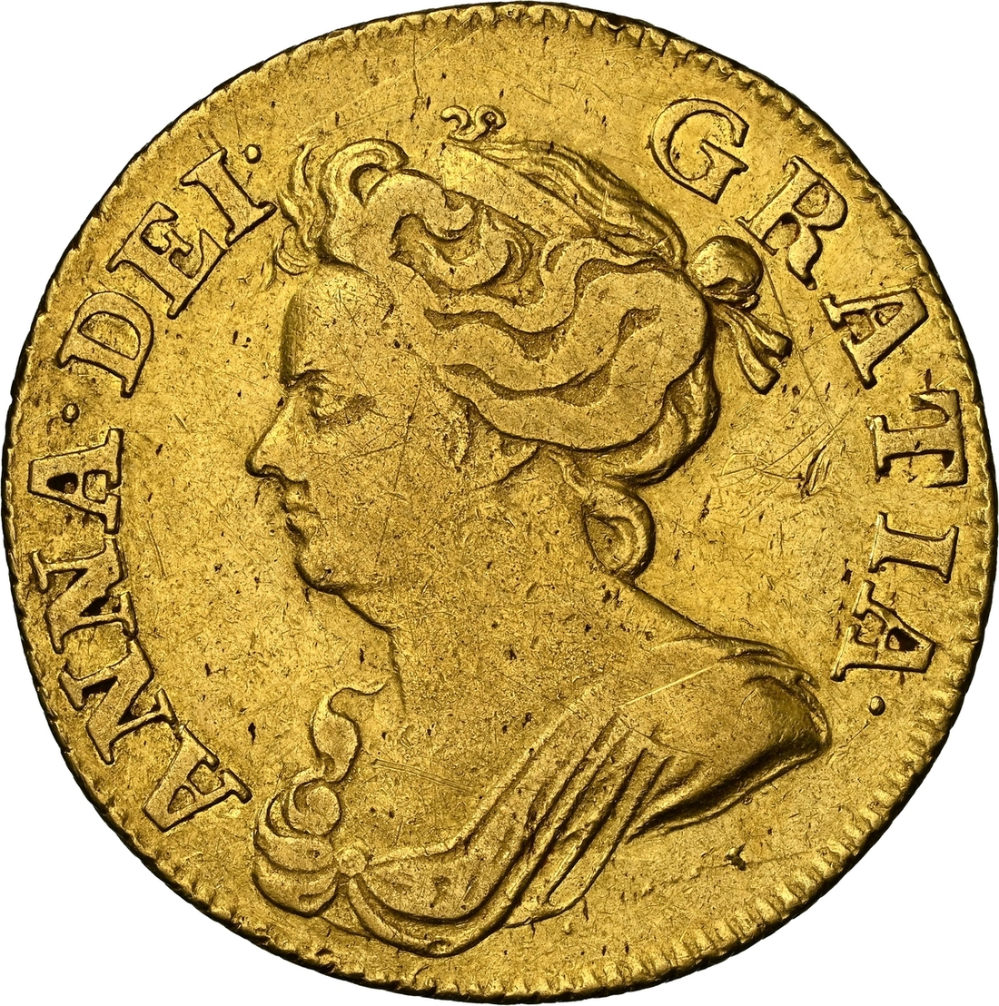 (x) NGC XF | Anne (1702-1714), Post-Union, Guinea, 1710, 'Wide Date', third diademed and draped bust left, rev. crowned shields cruciform, six strings to harp, emblem-adorned sceptres in angles, edge obliquely milled, 8.245g, 6h (MCE 222; Farey 530; EGC I, 474; Ellerby 166; S.3574), historic gouges in second quarter of reverse, and scratches behind head, otherwise strictly a bolder fine, in NGC Black 'Pallas' holder, generously graded Extremely Fine (Cert. #8534315-009)
