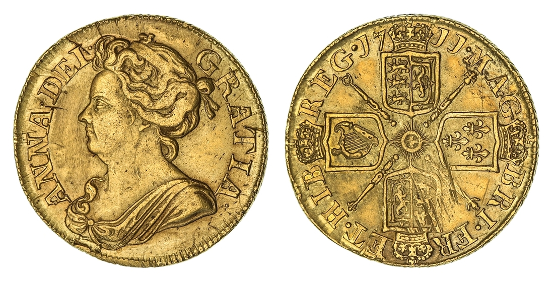 Anne (1702-1714), Post-Union, Guinea, 1711, third draped bust left, rev. crowned shields cruciform, six strings to harp, edge obliquely milled, 8.34g, 5h (MCE 223; EGC 475; S.3574), ex mount[?], slight rub but residual lustre, the occasional scuff, but otherwise very fine