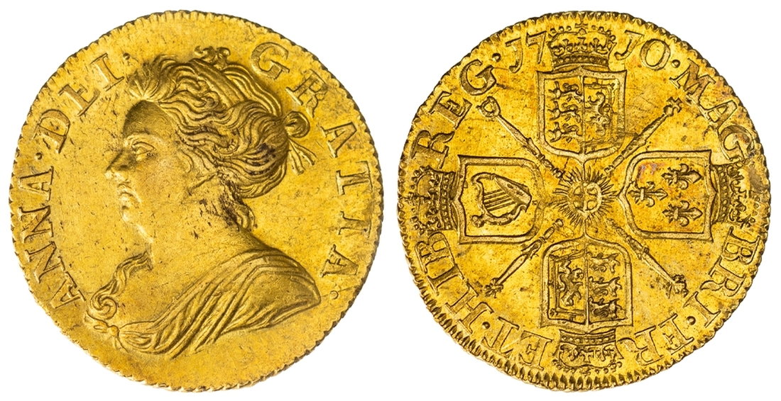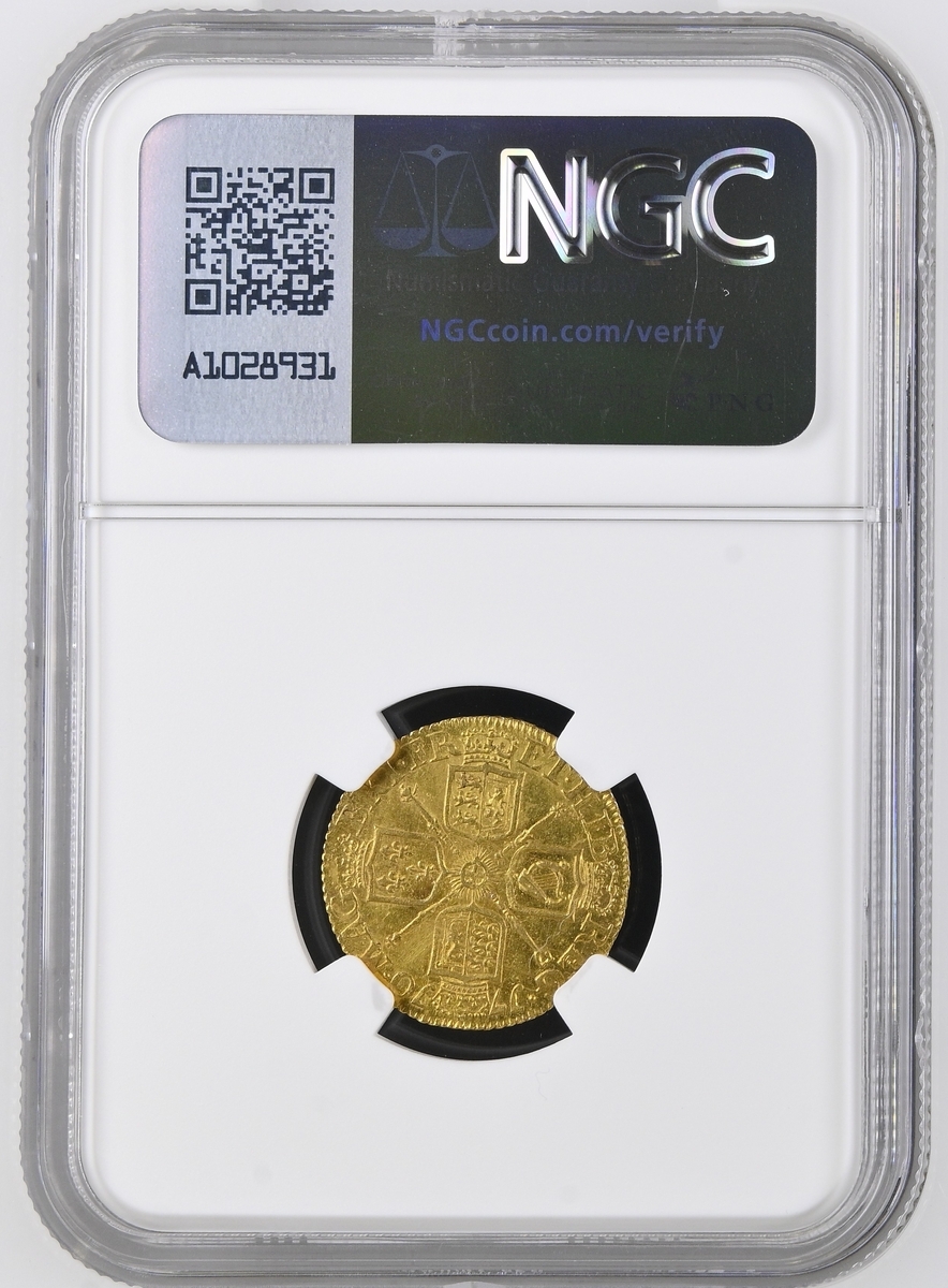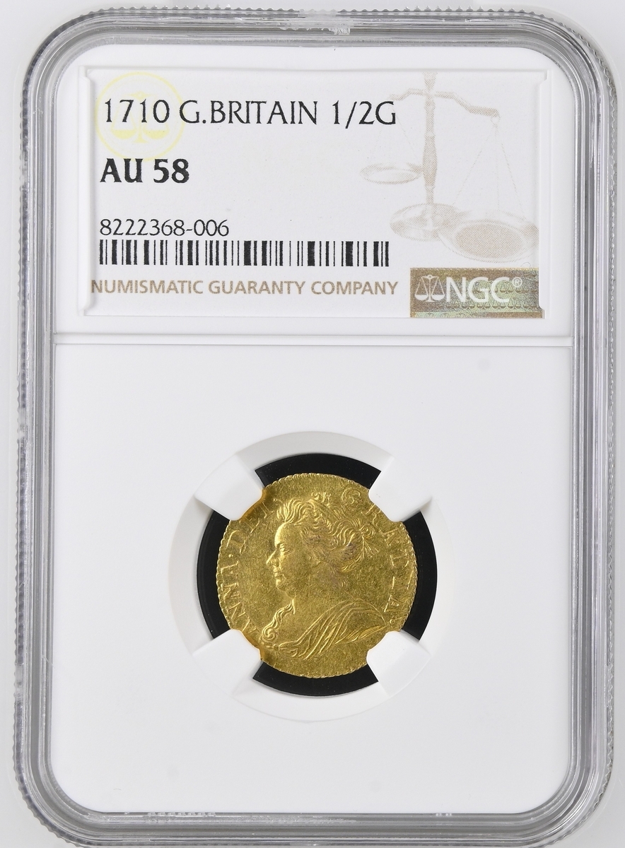 NGC AU58 | Anne (1702-1714) Half Guinea, 1710, draped bust left, rev. crowned cruciform shields, sceptres in angles, 4.15g, 6h (EGC I, 489; MCE 233; S.3575), with a residual cartwheel lustre, brilliant surfaces, about extremely fine, in NGC holder, graded AU58 (Cert. #8222368-006)