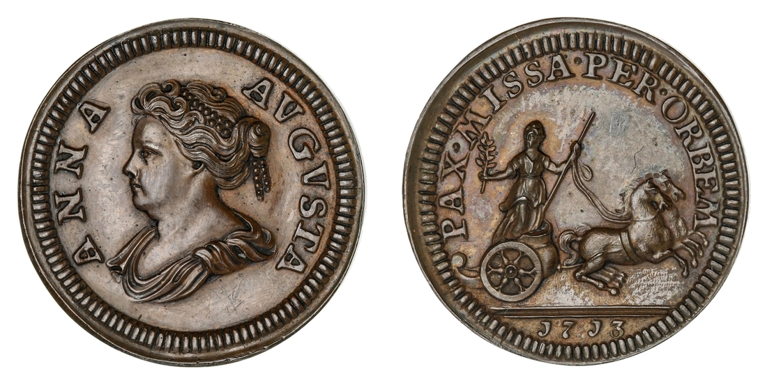 Anne (1702-1714), Copper Pattern Farthing, 1713, ANNA AVGVSTA, draped bust left, rev. PAX . MISSA . PER . ORBEM, Pax driving a chariot right, holding branch and spear, date in exergue, edge plain, 5.42g, 12h (Cooke 492; BMC [Peck] 764 [5+G]), obverse cleaned and with resulting faint hairlines, small scratch to reverse, nonetheless toned, with chocolate brown surfaces, bolder very fine, rare