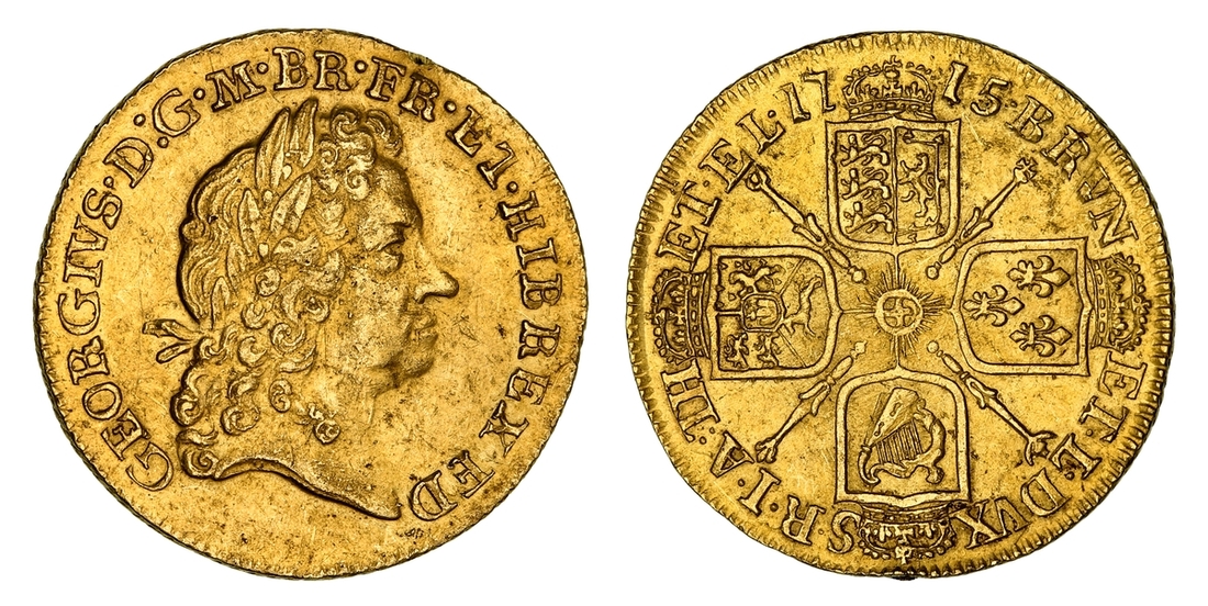 George I (1714-1727), Guinea, 1715, third laureate head right, rev. crowned shields cruciform, eight strings to harp, seven hearts to Hanoverian shield, edge obliquely milled, 8.40g, 5h (MCE 247; EGC 504; S.3630), edge nick, light bagmarking, otherwise very fine
