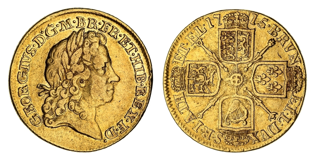 George I (1714-1727), Guinea, 1715, third laureate head right, rev. crowned shields cruciform, eight strings to harp, edge obliquely milled, 8.26g, 5h (MCE 247; EGC 504; S.3630), flattened portrait, occasional light scuffs and smoothing, otherwise good fine