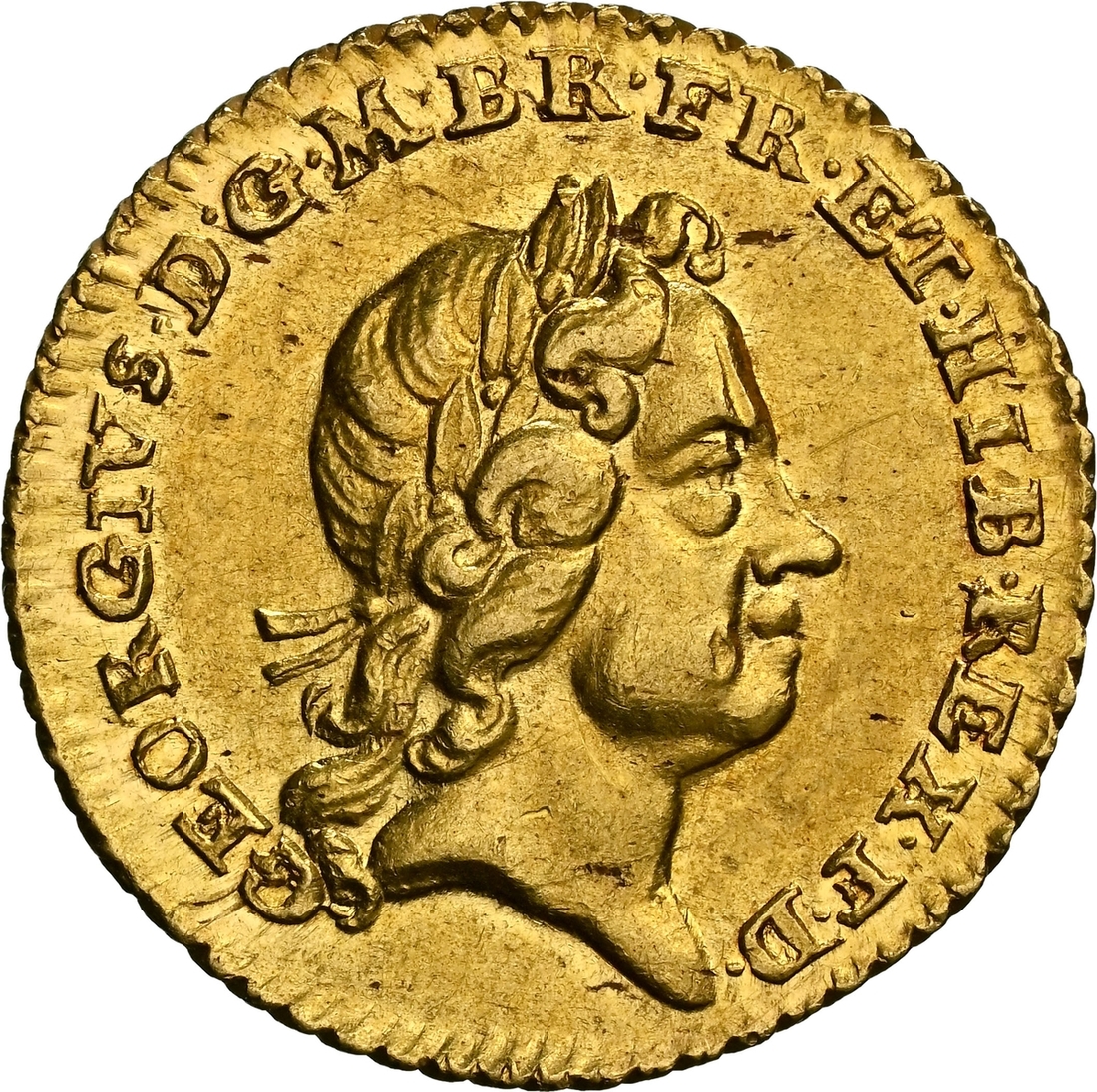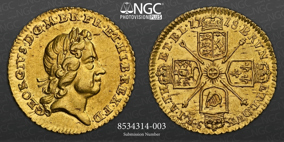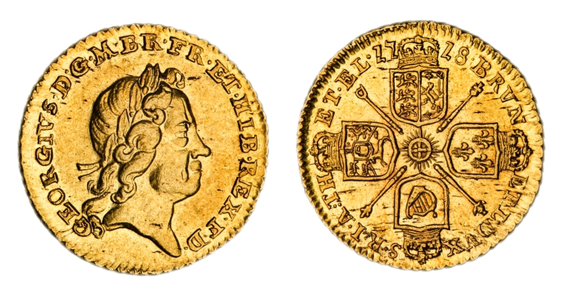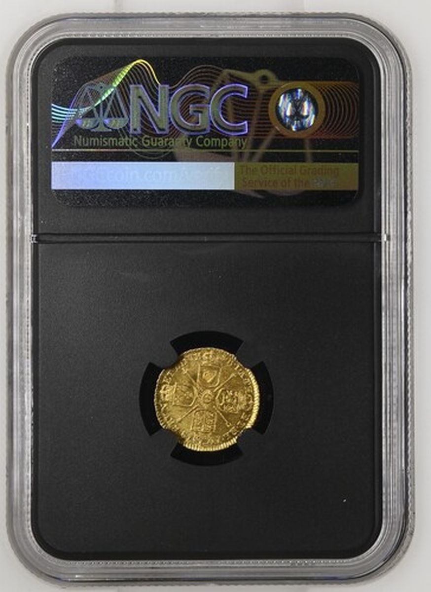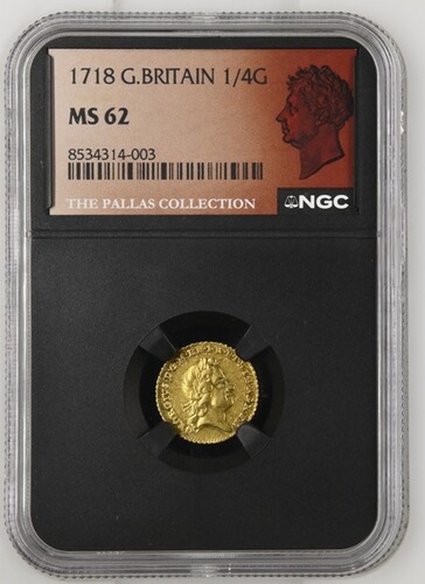 (x) NGC MS62 | George I (1714-1727), Quarter-Guinea, 1718, laureate head right, rev. crowned shields cruciform, emblem-adorned sceptres in angles, five strings to harp, edge obliquely milled, 2.074g, 6h (MCE 277; Schneider II, 554; EGC I, 550; S.3638), small mark before eye and a trace of flecking to lustrous, original fields, almost extremely fine, and a thoroughly pleasing example of this popular diminutive issue struck in answer to the great national silver shortage, in NGC Black 'Pallas' holder, graded MS62 (Cert. #8534314-003)