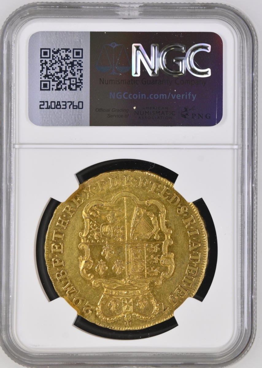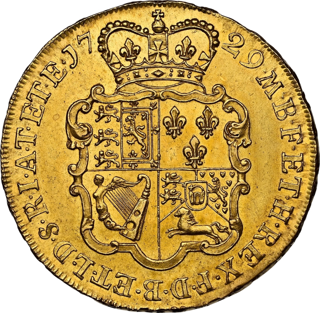 NGC AU58 | George II (1727-1760), Five-Guineas, 1729 TERTIO, younger laureate head left, plain below truncation, rev. crowned garnished shield, eleven strings to harp, edge lettering upwards, inverted Ns in ANNO, 41.84g, 6h (MCE 278; King 160; Stratos -; EGC I, 552; GH 80; S.3663), light sporadic surface marks in otherwise lustrous original fields, near extremely fine, a most presentable and pleasing specimen, in NGC holder, graded AU58 (Cert. #8220557-001)