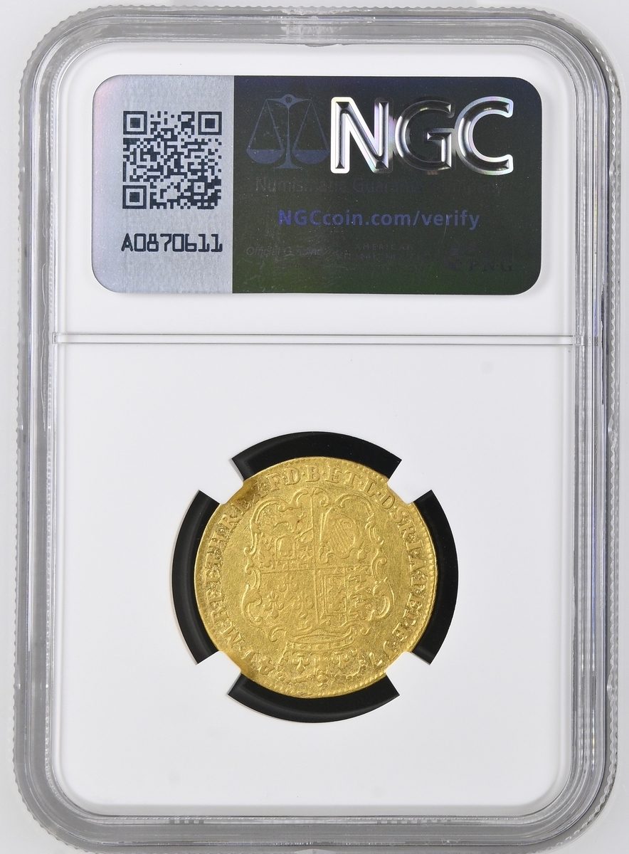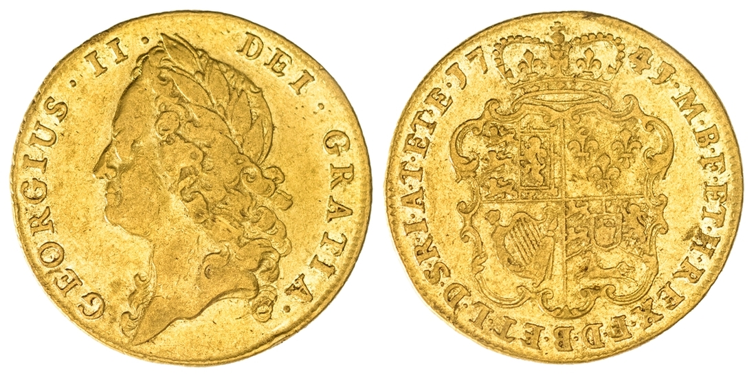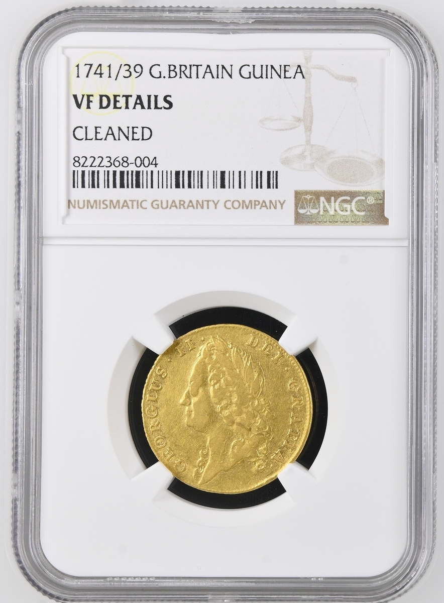 NGC VF | George II (1727-1760), Guinea, 1741/39, intermediate laureate head left, rev. crowned shield of arms, 8.29g, 6h (EGC 602 [R4]; MCE -; S.3676), extremely rare, with rub to the portrait but otherwise near very fine, very harshly graded in the opinion of the cataloguer, in NGC holder, graded VF Details ~ Cleaned (Cert. #8222368-004)