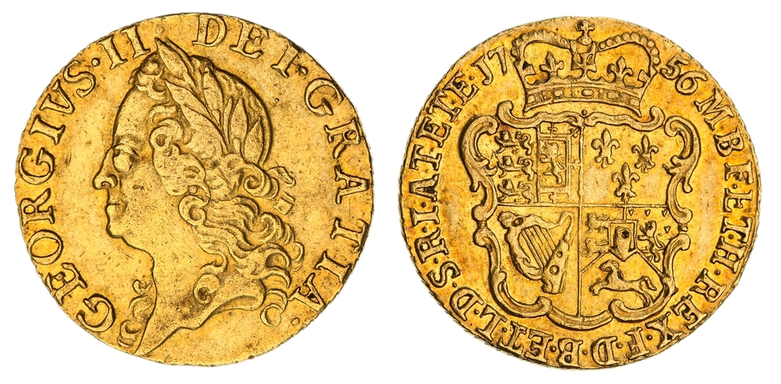 (x) George II (1727-1760), 'Old Head' Half-Guinea, 1756, older laureate head left, rev. crowned garnished shield, six strings to harp, edge obliquely milled, 4.16g, 6h (EGC 658; MCE 364; S.3685), some smoothing to the edge and evidence of previous mounting, lightly contact marked and wiped, toned to reverse, very fine