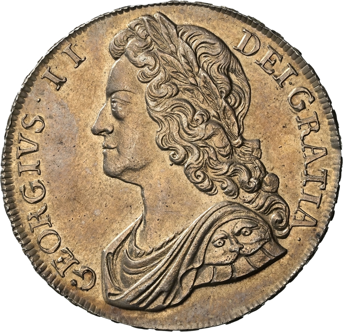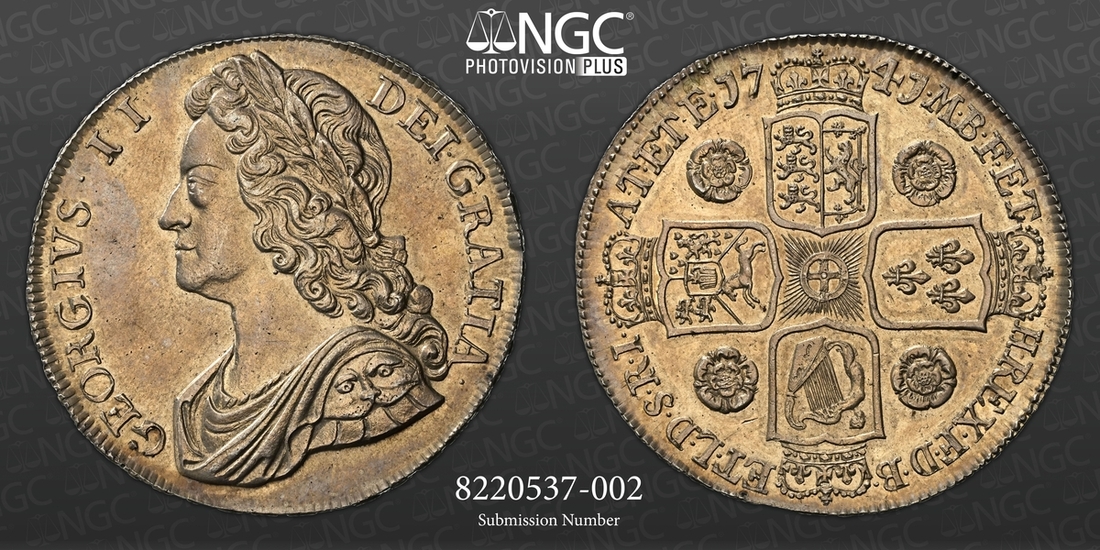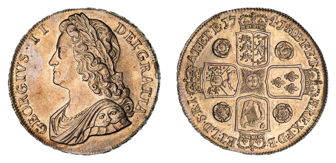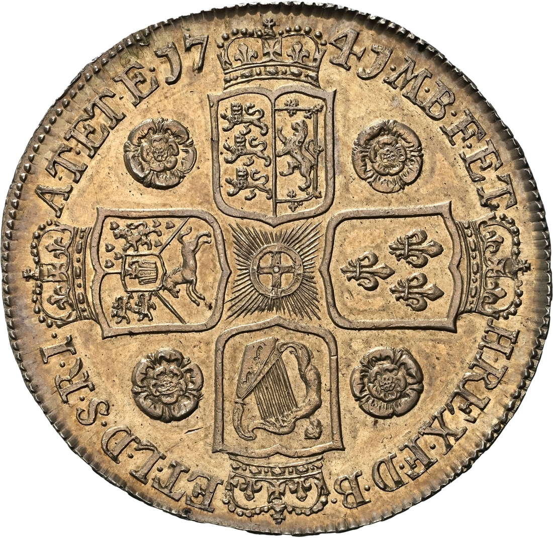 (x) NGC MS62 | George II (1727-1760), Crown, 1741 DECIMO QVARTO, young laureate, draped and cuirassed bust left, rev. four crowned shields cruciform, roses in angles, eight strings to harp, seven hearts, downwards lettered edge, 29.970g, 5h (Bull 1666; ESC 122; S.3687), lightly wiped and retoned, with much original lustre, a most attractive extremely fine, bolder still in parts, in NGC holder, graded MS62 (Cert. #8220537-002)