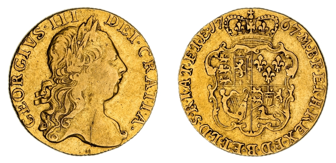 (x) George III (1760-1820), 'Rose' Guinea, 1767, third young laureate bust right, rev. crowned shield, seven strings to harp, edge chevron milled, 8.29g, 6h (MCE 372; EGC I, 677 [R3]; Farey 1061; S.3727), a scratch on neck, and rubbed but residually lustrous, a bolder fine / very fine, a scarcer year