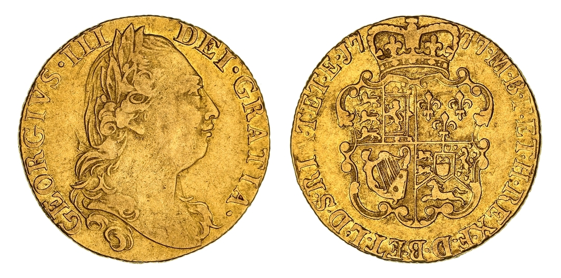 George III (1760-1820), 'Rose' Guinea, 1777, fourth laureate head right, rev. crowned garnished shield, nine strings to harp, edge chevron milled, 8.29g, 6h (MCE 382; EGC I, 695; S.3728), slightly flattened details, bagmarks, otherwise very fine