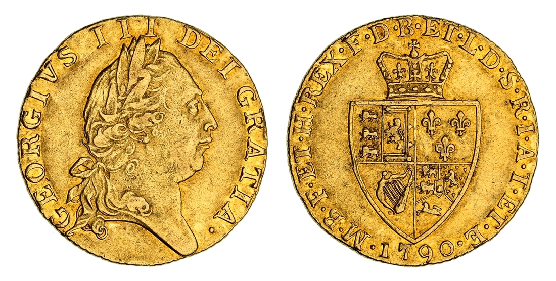 George III (1760-1820), 'Spade' Guinea, 1790, 'Small 90', fifth laureate head right, rev. crowned shield, edge chevron milled, 8.34g, 12h (MCE 394 variety; Farey 1290; EGC 718; S.3729), potentially ex-mount with some edge evidence, previously cleaned, details slightly flattened, some hairlines, otherwise very fine