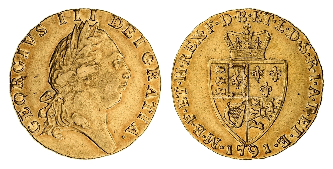 George III (1760-1820), 'Spade' Guinea, 1791, fifth laureate bust right, rev. crowned shield, seven strings to harp, edge chevron milled, 8.33g, 12h (MCE 395; EGC 719; Farey 1300; S.3729), lightly contact marked and with softness to the tops of devices, with a hint of red tone, very fine