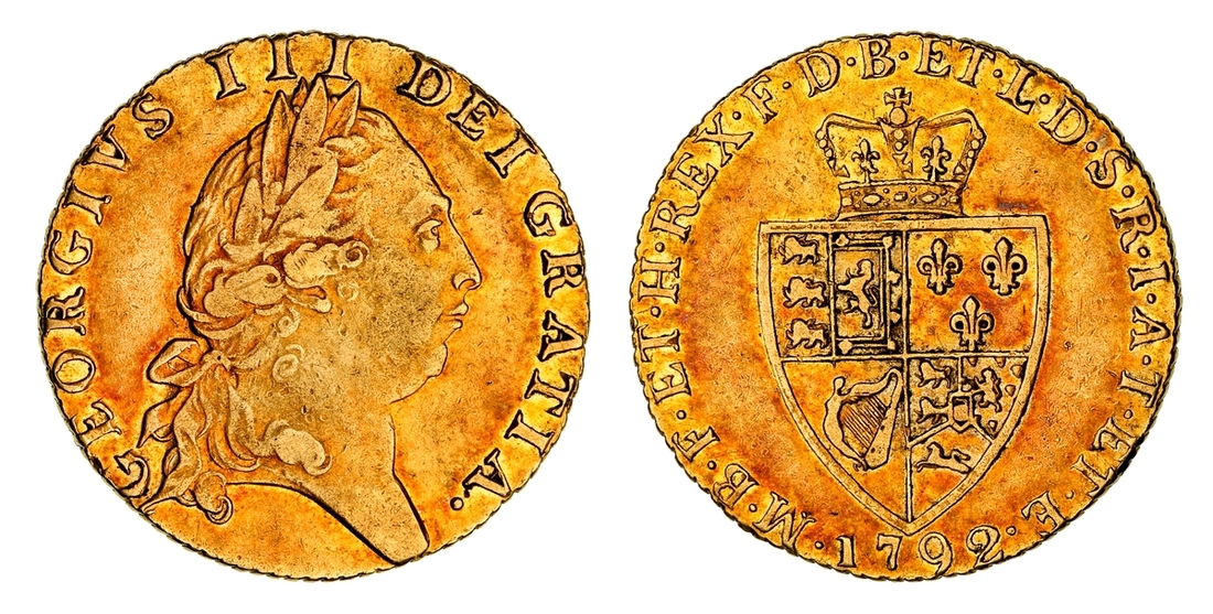 George III (1760-1820), 'Spade' Guinea, 1792, 'Large 92', fifth laureate bust right, rev. crowned shield, seven strings to harp, edge chevron milled, 8.36g, 12h (MCE 396; EGC 720; Farey 1315; S.3729), toned, especially to the recesses, slight rub to higher devices, nonetheless lustrous, good very fine