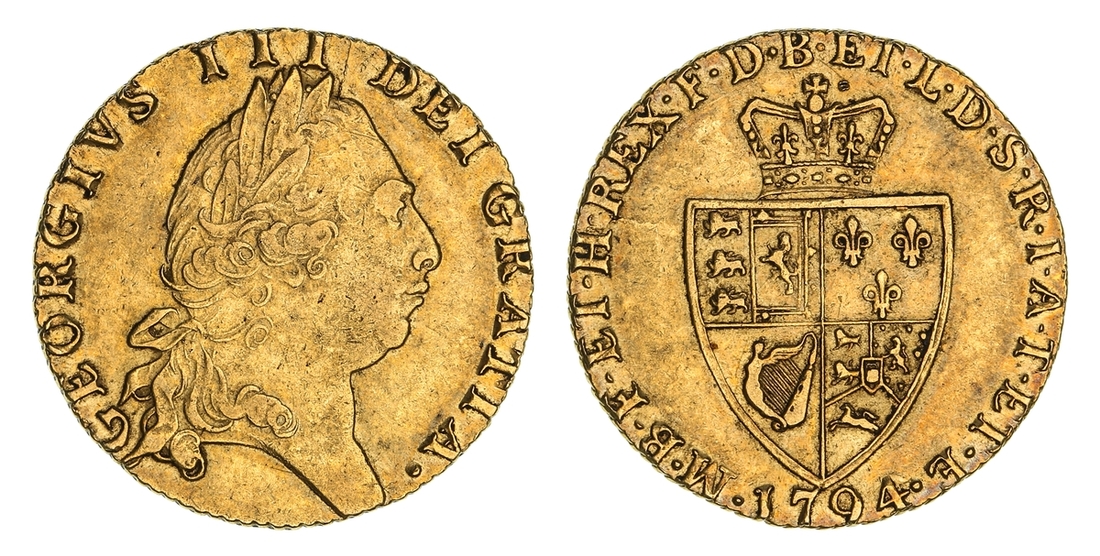 George III (1760-1820), 'Spade' Guinea, 1794, fifth laureate head right, rev. crowned shield, eight strings to harp, edge chevron milled, 8.37g, 12h (MCE 398; EGC 725; S.3729),softness to the higher devices, near very fine