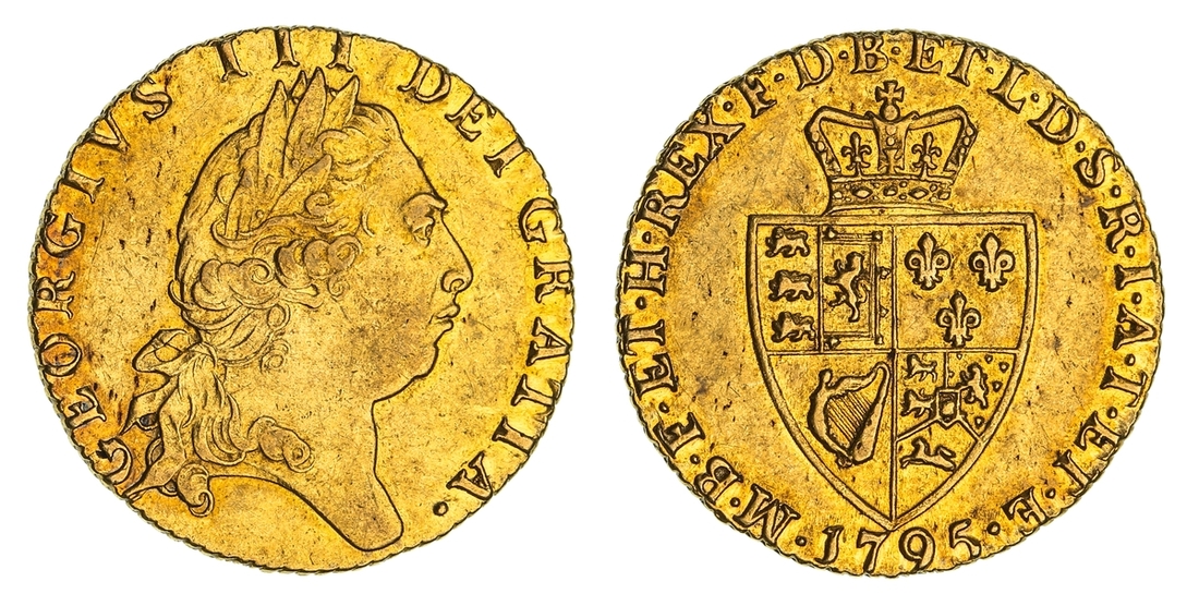 George III (1760-1820), 'Spade' Guinea, 1795, fifth laureate bust right, rev. crowned shield, six strings to harp, edge chevron milled, 8.35g, 12h (MCE 399; EGC 726; Farey 1340; S.3729), light haymarking, toned in the legend, lustrous, very fine