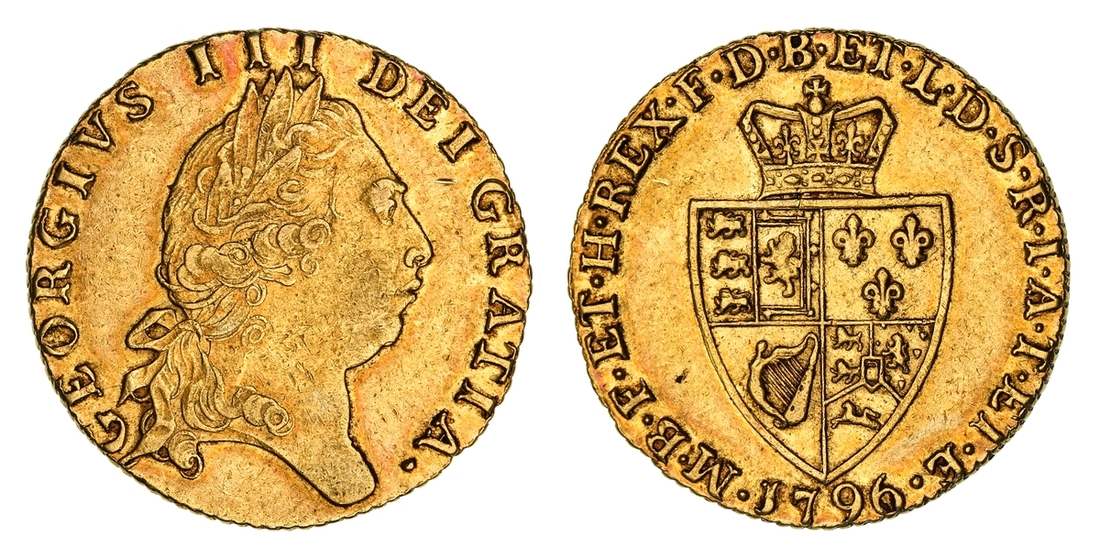 George III (1760-1820), 'Spade' Guinea, 1796, fifth laureate head right, rev. crowned Spade shield, seven strings to harp, chevron milled edge, 8.40g, 12h (MCE 400; Farey 1350; EGC 729; S.3729), light hairlining with a couple of small surface nicks, lightly toned, very fine, a scarce date