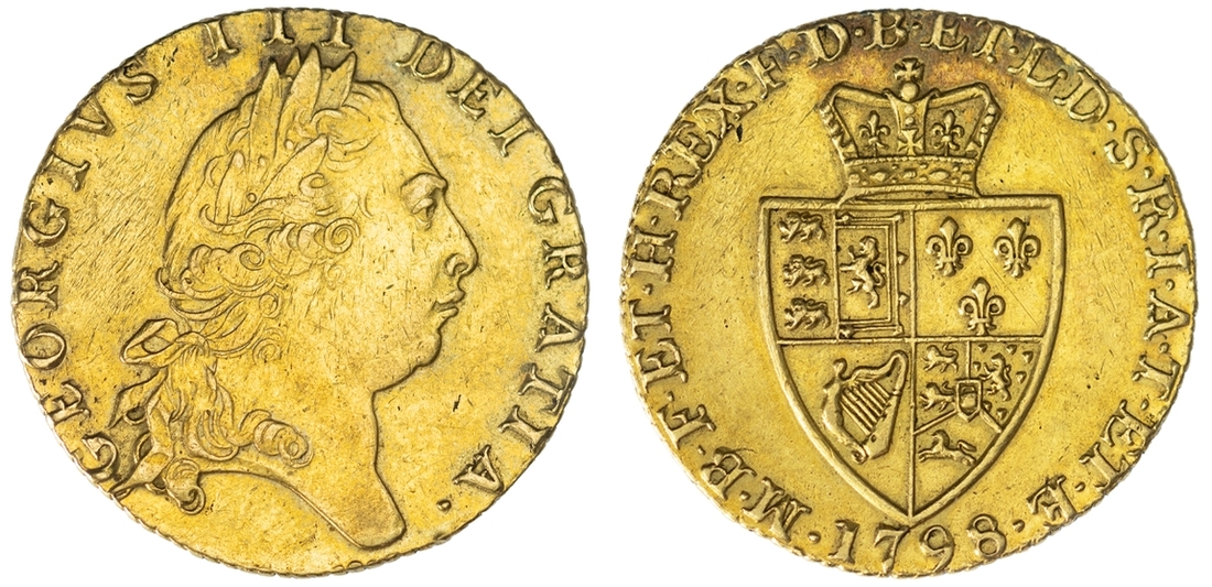 NGC AU | George III (1760-1820), 'Spade' Guinea, 1798, fifth laureate head right, rev. crowned 'Spade' shield, seven strings to harp, edge milled, 8.33g, 12h (MCE 402; Farey 1370; EGC 732; S.3729), cleaned with tooling present on obverse, otherwise very fine, in NGC holder, graded AU Details ~ Cleaned (Cert. #8222368-003)