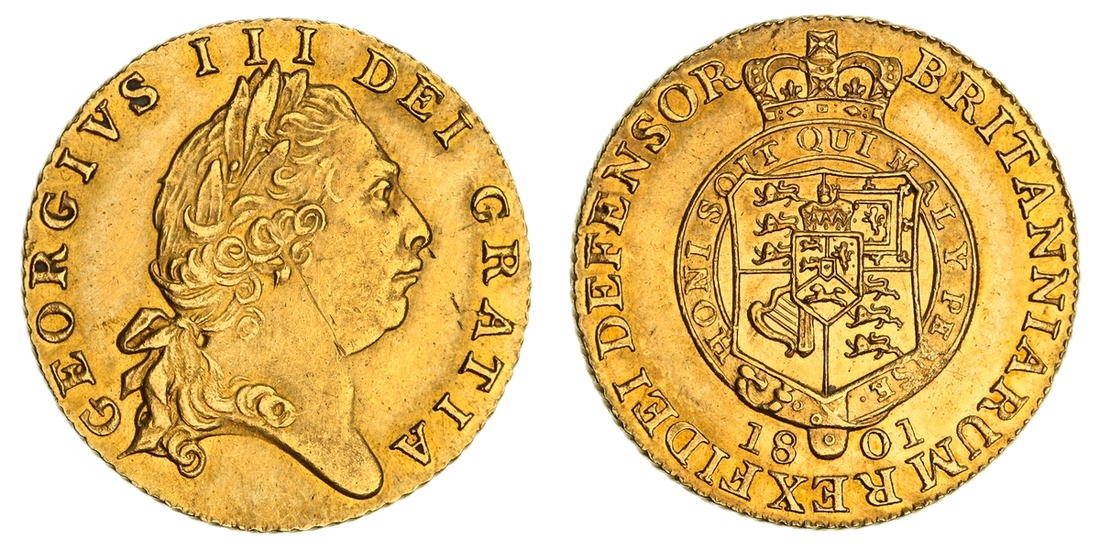 (x) George III (1760-1820), 'Garter' Half-Guinea, 1801, sixth laureate bust right, rev. crowned shield in Garter, four strings to harp, edge obliquely milled, 4.21g, 12h (EGC 845; MCE 439; S.3736), old hairline scratch to obverse, otherwise lustrous and pleasingly so to the reverse, good very fine / extremely fine