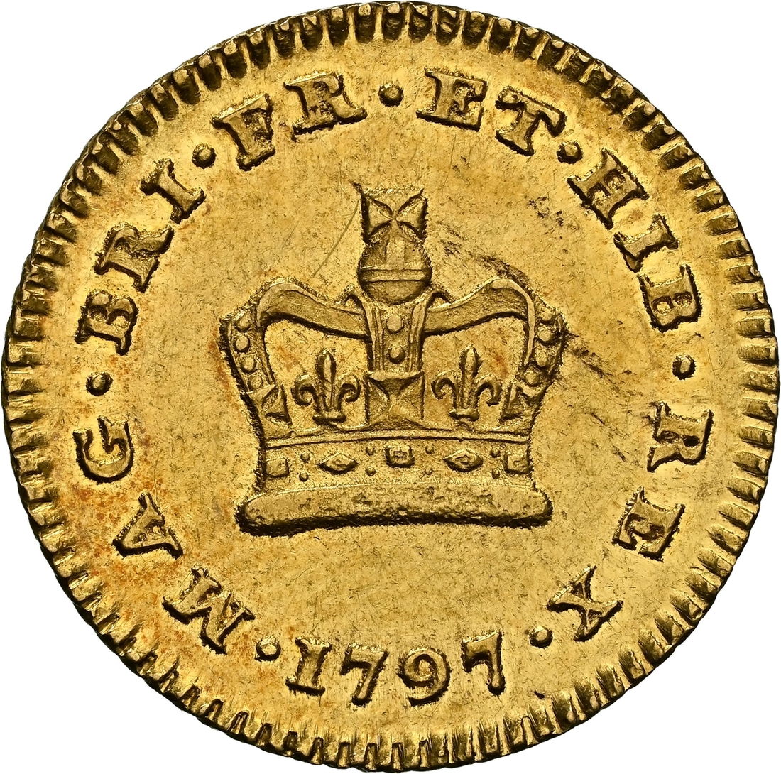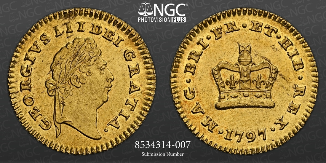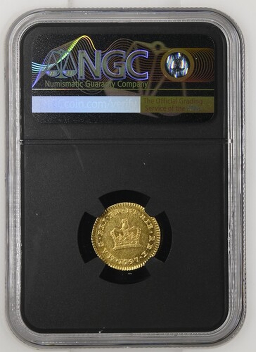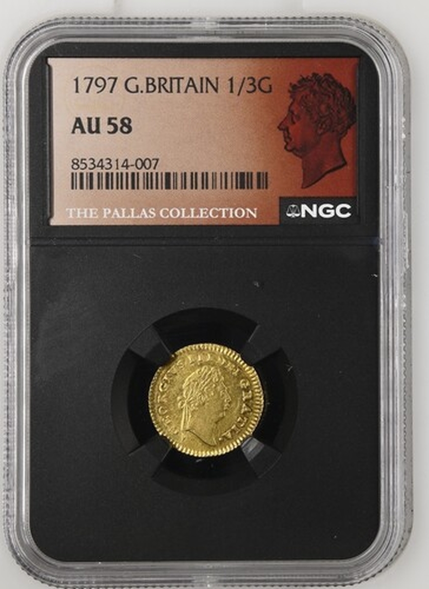 (x) NGC AU58 | George III (1760-1820), Third-Guinea, 1797, Type 1, first laureate head right, rev. crown, date in legend, edge obliquely milled, 2.798g, 12h (MCE 449; EGC I, 867; S.3738), lightly flecked but lustrous, a pleasing extremely fine, in NGC Black 'Pallas' holder, graded AU58 (Cert. #8534314-007)