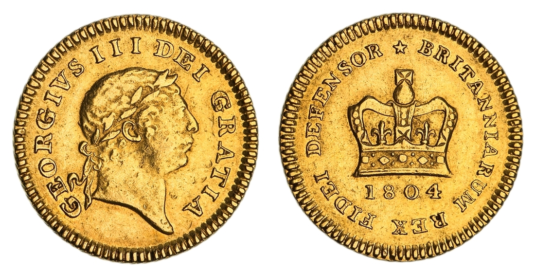 (x) George III (1760-1820), Third-Guinea, 1804, Type 2, second laureate head right, rev. crown, edge obliquely milled, 2.79g, 12h (MCE 456; EGC I, 874; S.3740), some contact marking, otherwise with a slight lustre, very fine