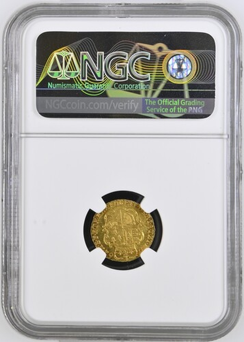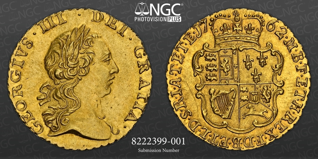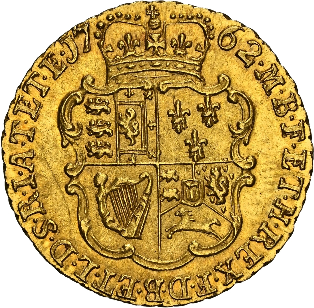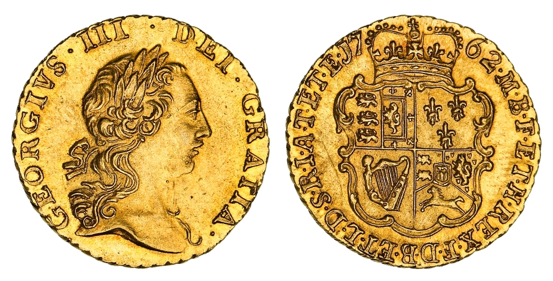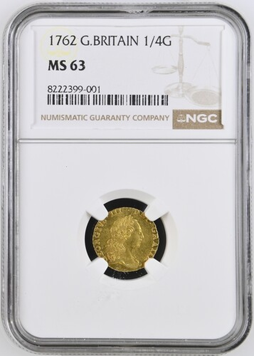 NGC MS63 | George III (1760-1820), Quarter-Guinea, 1762, laureate head right, rev. crowned and garnished shield, seven strings to harp, edge obliquely milled, 2.09g, 7h (Schneider II, 627; MCE 463; EGC I, 886; Stratos 25-26; S.3741), pleasingly lustrous, extremely fine, in NGC holder, graded MS63 (Cert. #8222399-001)