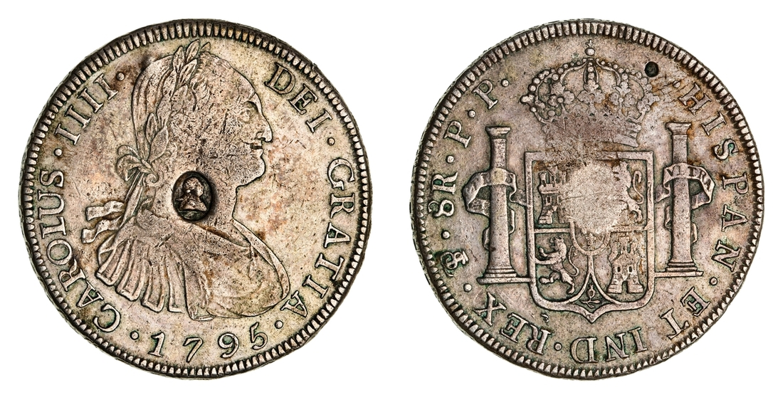 (x) George III (1760-1820), Emergency Issues (1797-1799), Oval-Countermarked Dollar (8-Reales), struck over Charles IV, 8-Reales, 1795-PTS PP, Potosi, CAROLUS · IIII · DEI · GRATIA · laureate and draped bust right, oval countermark of George III in centre, rev. · HISPAN · ET IND · REX · PTS · 8R · P · P · crowned square-topped shield dividing pillars, security edge, 26.59g, 12h (Bull 1857; ESC 131; S.3765A), attempted piercing in reverse legend, otherwise lightly cleaned and rubbed, the host coin very fine, the countermark bolder still, a scarcer prototype for the infamous 'Head of a Fool on the Neck of an Ass' specie!