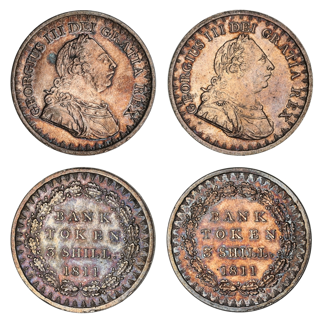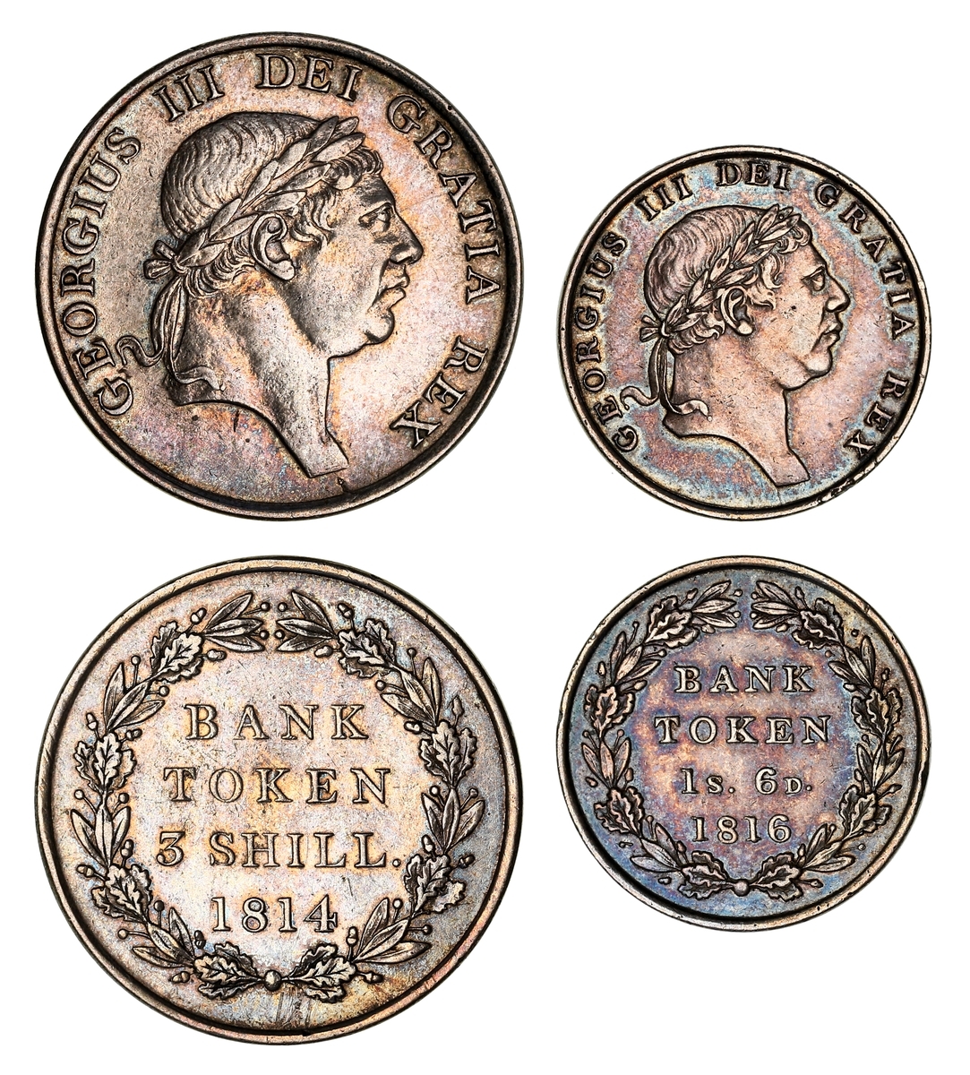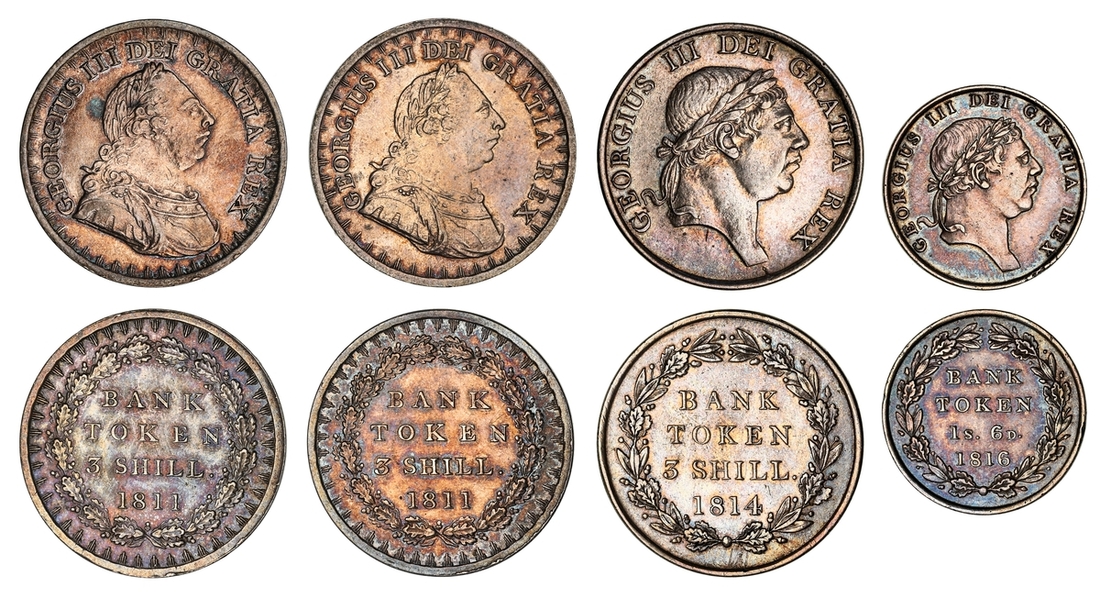 George III (1760-1820), Bank Tokens (4), Three Shillings, 1811 (2), first laureate, draped and cuirassed bust right, rev. value in wreath, edges plain, 12h, 14.63g (ESC 408; Bull 2065; S.3769), lightly hairlined to glossy and toned surfaces, good very fine; 12h, 14.67g (ESC 408; Bull 2065; S.3769), lightly hairlined, glossy and toned surfaces, very fine; Three Shillings, 1814, second laureate bust right, rev. value in wreath, edge plain, 14.61g, 12h (ESC 422; Bull 2083; S.3770), light contact marks and softness to tops of devices, very fine; Eighteenpence, 1816, as before, edge plain, 7.29g, 12h (ESC 979; Bull 2123; S.3772), lightly contact marked, toned, very fine (4)