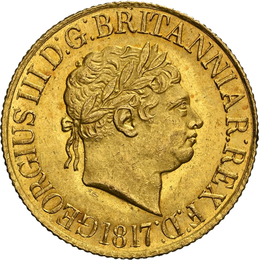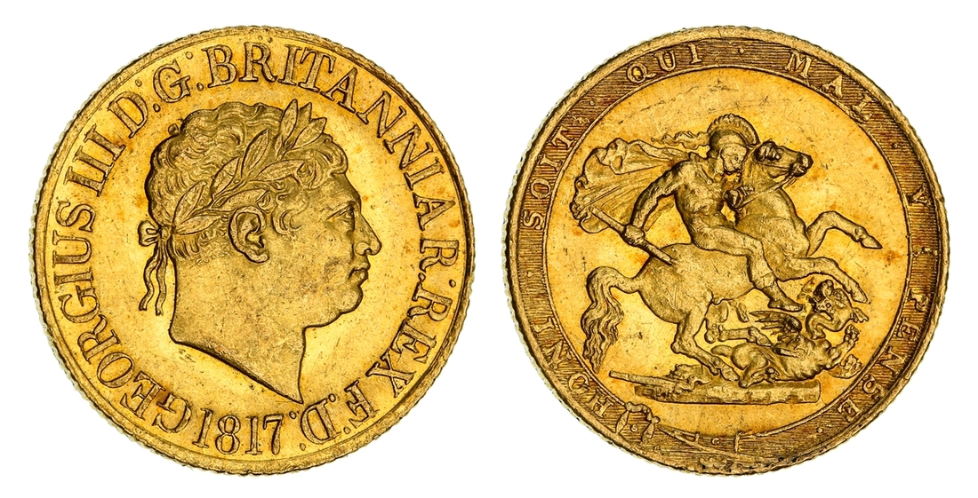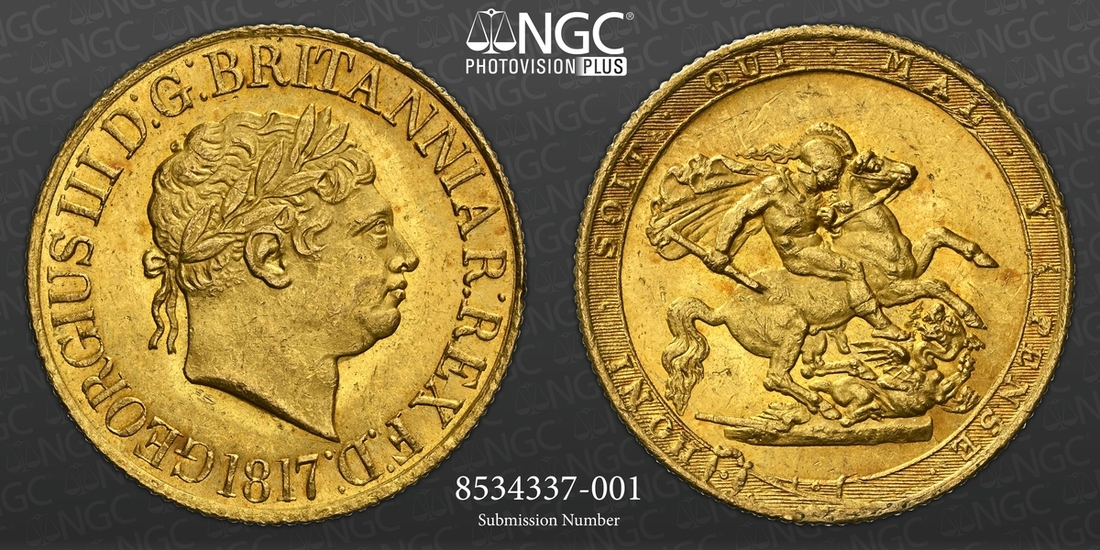 (g) NGC MS63 | George III (1760-1820), 'New Coinage' Sovereign, 1817, laureate head right, rev. St George and Dragon within Garter, edge milled, 7.98g, 6h (Marsh 1; MCE 464; EGC 895; Stratos 114; S.3785), light pinmark scuffing to otherwise handsomely lustrous surfaces, with a hint of red tone, good extremely fine, in NGC holder, graded MS63 (Cert. #8534337-001)