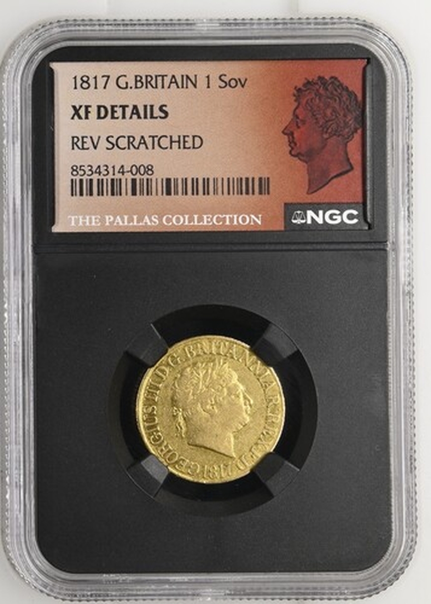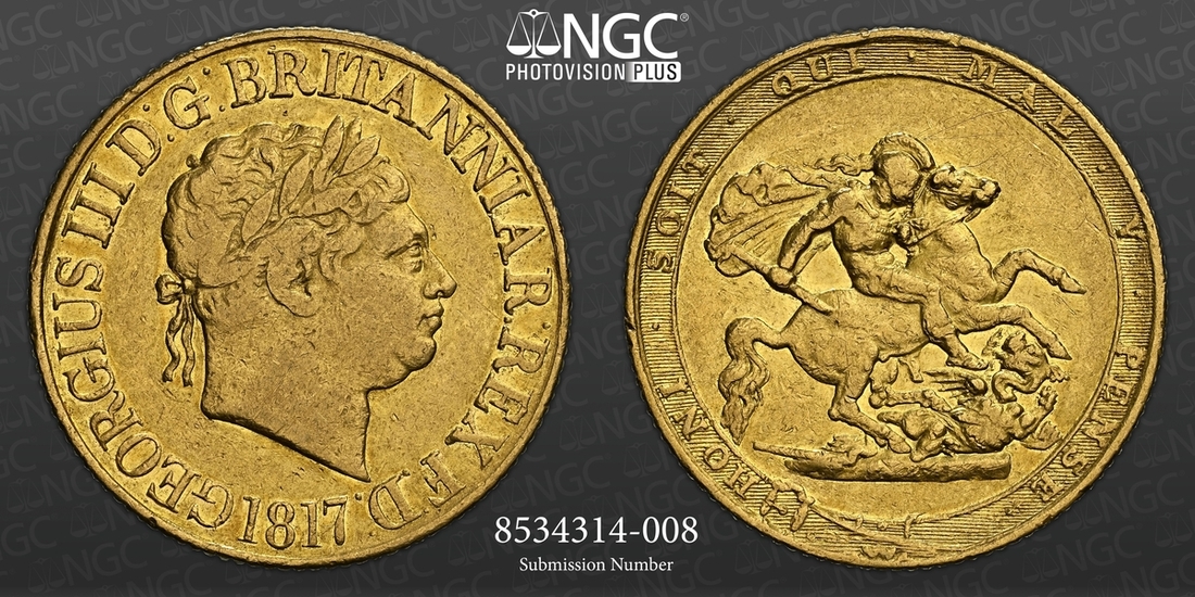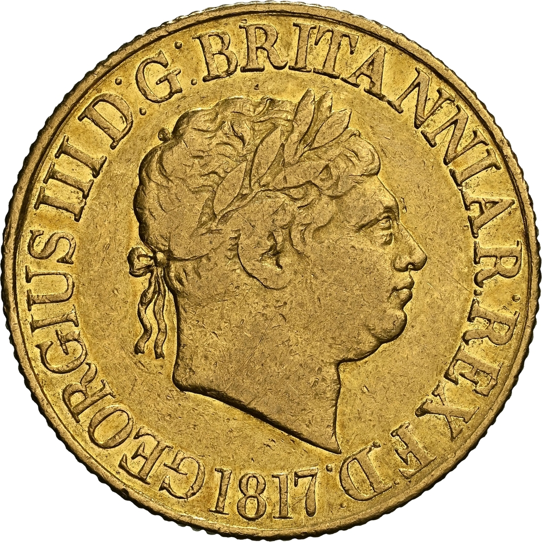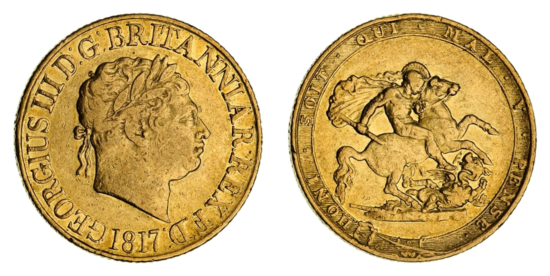(g) NGC XF | George III (1760-1820), 'New Coinage', Sovereign, 1817, laureate head right, rev. St George and Dragon, edge milled, 7.914g, 6h (Marsh/Hill 1; MCE 464; EGC II, 895; Stratos 114; S.3785), rubbed but residually lustrous, the centres bolder than fine, the peripheries very fine or better, the supremely popular seminal year of issue, in NGC Black 'Pallas' holder, graded Extremely Fine (Cert. #8534314-008)