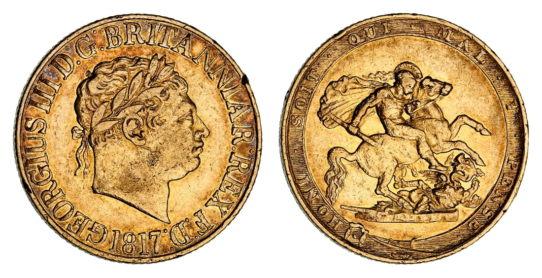 (g) George III (1760-1820), 'New Coinage', Sovereign, 1817, laureate head right, rev. St George and Dragon within Garter, edge milled, 7.94g, 6h (Marsh 1; MCE 464; EGC 895; Stratos 114; S.3785), light hairlining, some rub to higher devices, otherwise near very fine