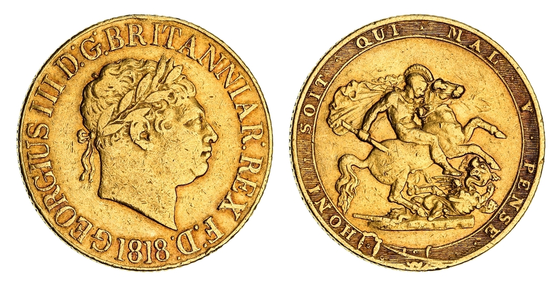 (g) George III (1760-1820), 'New Coinage', Sovereign, 1818, laureate head right, with ascending colon, rev. St George and Dragon within Garter, edge milled, 7.90g, 6h (Marsh 2A; MCE 465; EGC 900; S.3785A), bruise at 12 o'clock, cleaned and lightly bagmarked, near very fine