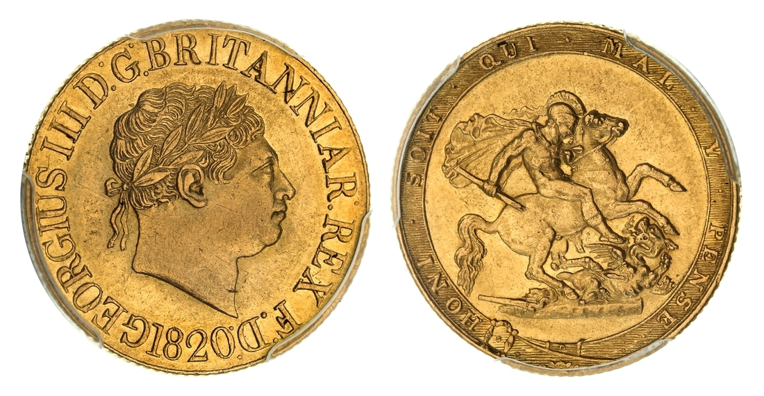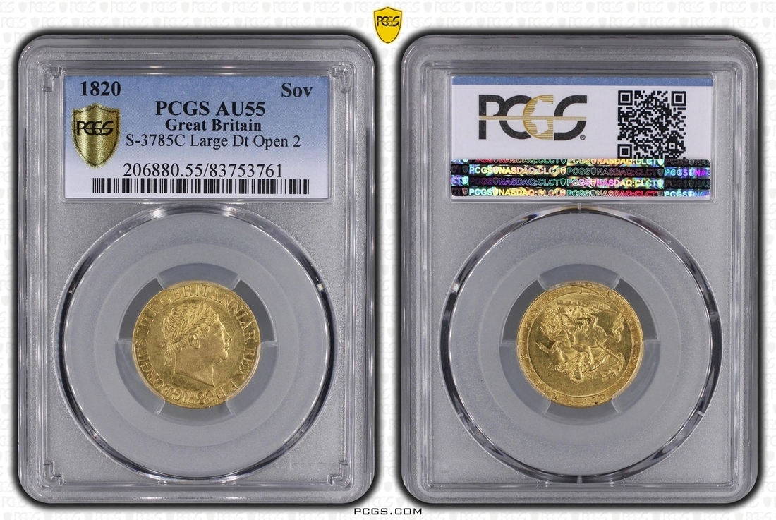 (g) PCGS AU55 | George III (1760-1820), 'New Coinage', Sovereign, 1820, 'Large Date' 'Open 2', laureate head right, rev. St George and Dragon within Garter, edge milled, 7.99g*, 6h (Bentley 7; MCE 466; Marsh 4; EGC 906; S.3785C), with a scattering of hairlines and light contact marks to otherwise pleasingly lustrous surfaces, really bold very fine to near extremely fine, in PCGS holder, graded AU55 (Cert. #83753761)