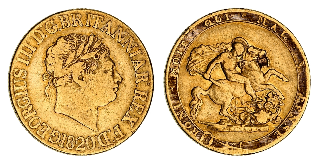 (g) George III (1760-1820), 'New-Coinage', Sovereign, 1820, Large Date, 'Open 2', laureate head right, rev. St George and Dragon within Garter, edge milled, 7.84g, 6h (Bentley 7; MCE 466; Marsh 4; EGC 906 [R2]; S.3785C), tooled to horse's head and rubbed to devices, bold fine