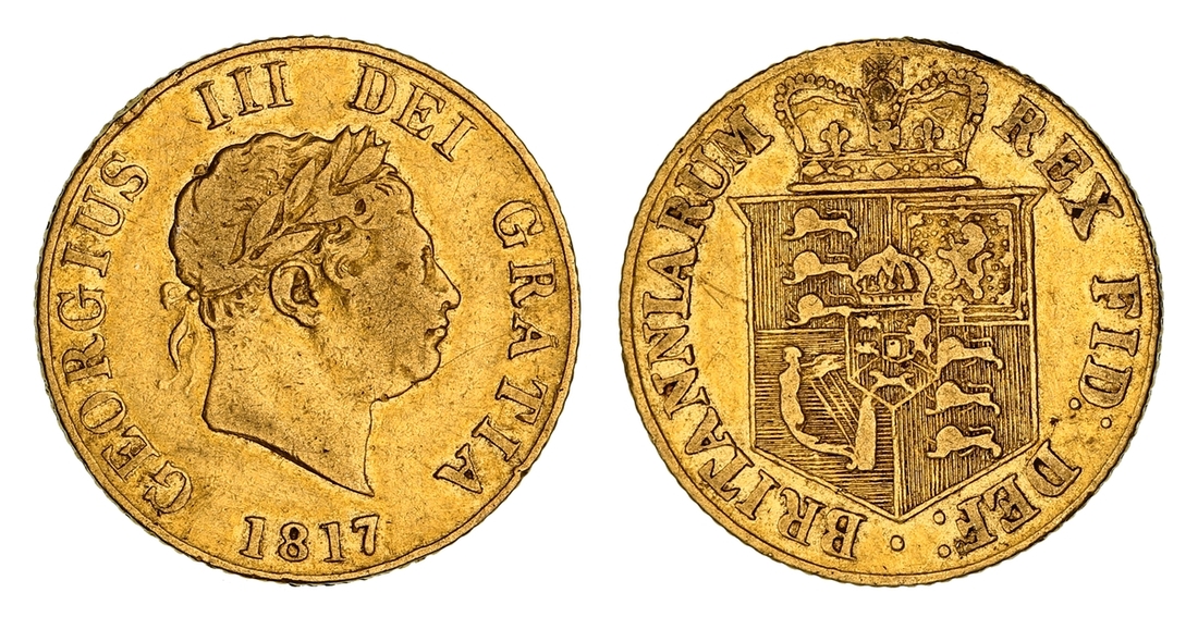 (g) George III (1760-1820) 'New Coinage', Half-Sovereign, 1817, laureate head right, rev. crowned shield, edge milled, 3.94g, 6h (Marsh 400; MCE 467; EGC II, 928; Selig 1083; S.3786), light edge knock, flatness to higher devices, otherwise very fine
