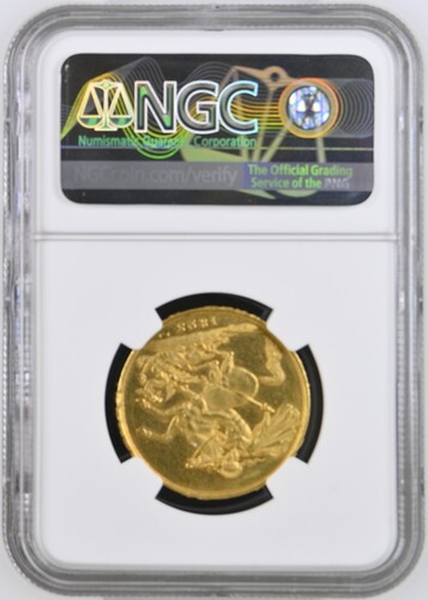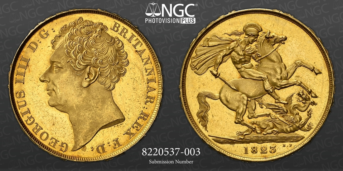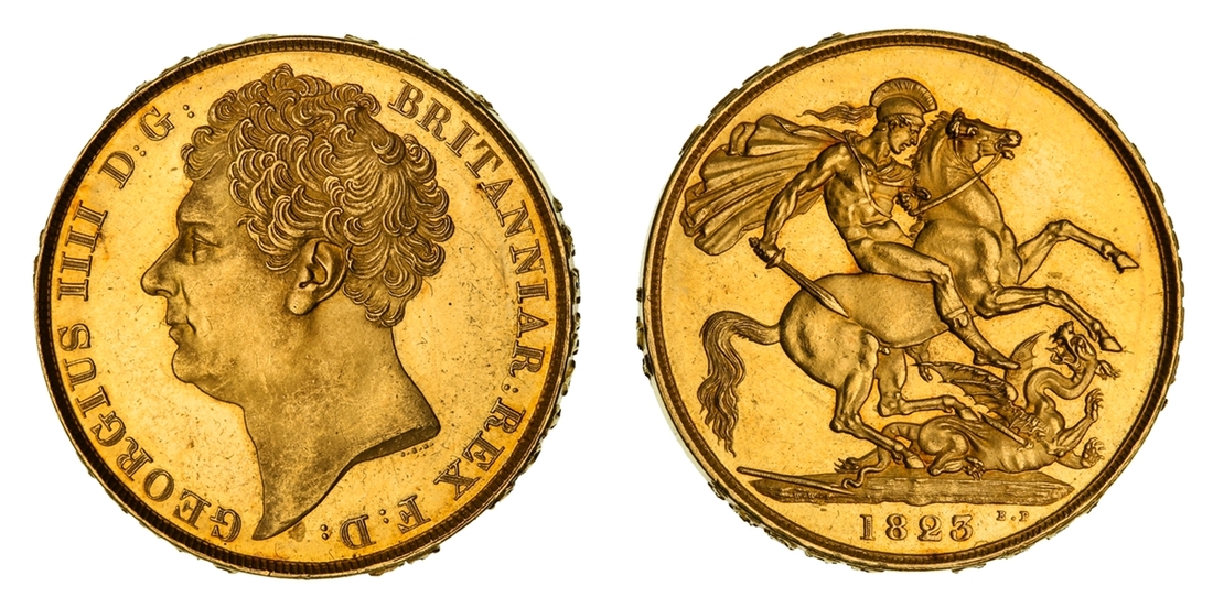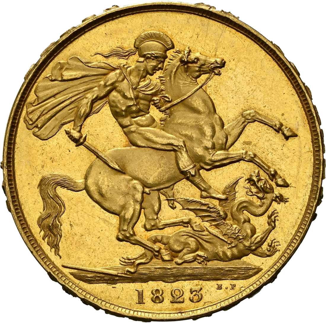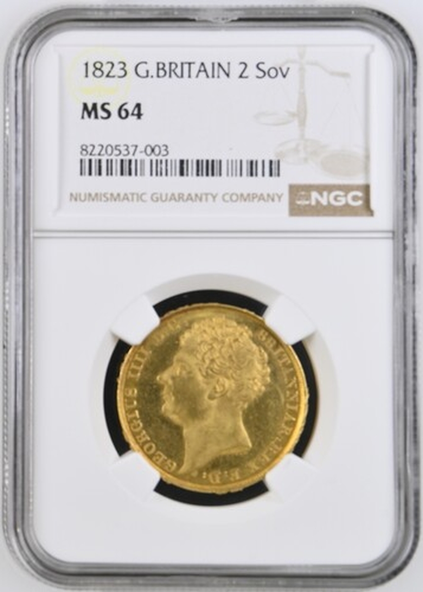 (g) NGC MS64 | George IV (1820-1830), Two-Pounds, 1823 IV, bare head left, rev. St George and Dragon, edge lettered DECUS ET TUTAMEN. ANNO REGNO IV. upwards, 15.98g, 6h (MCE 470; Marsh T6; EGC II, 945; Stratos 171; S.3798), deft bagmarks in lustrous, original fields, the portrait with handsome 'blooming', good extremely fine, a delightful example, in NGC holder, graded MS64 (Cert. #8220537-003)