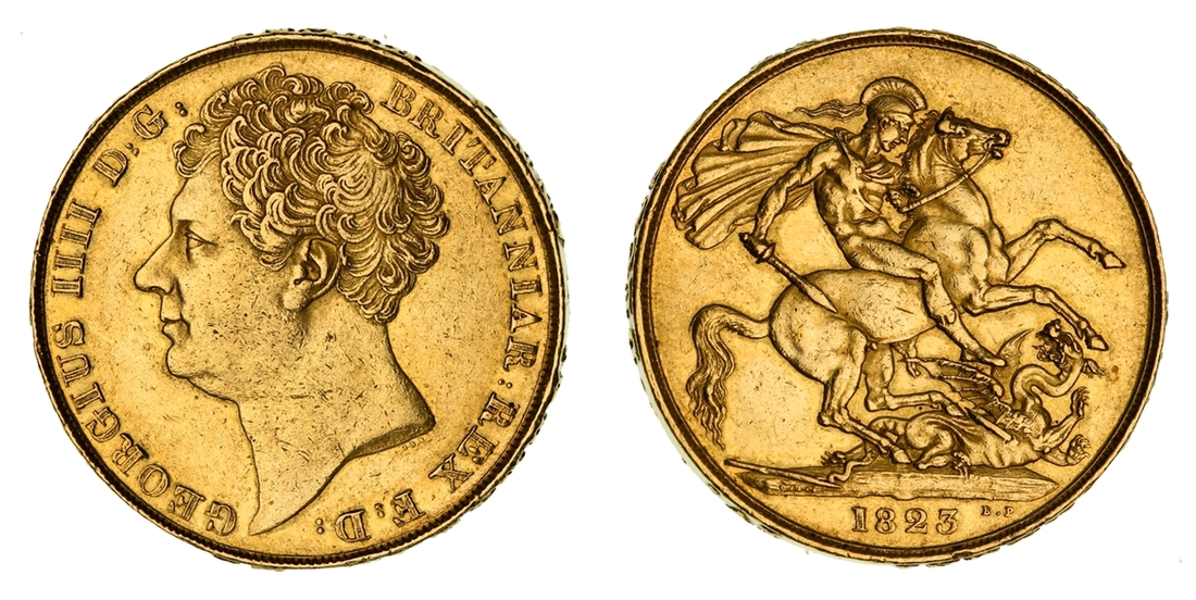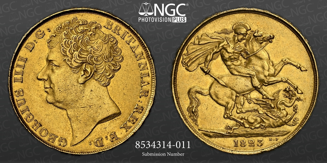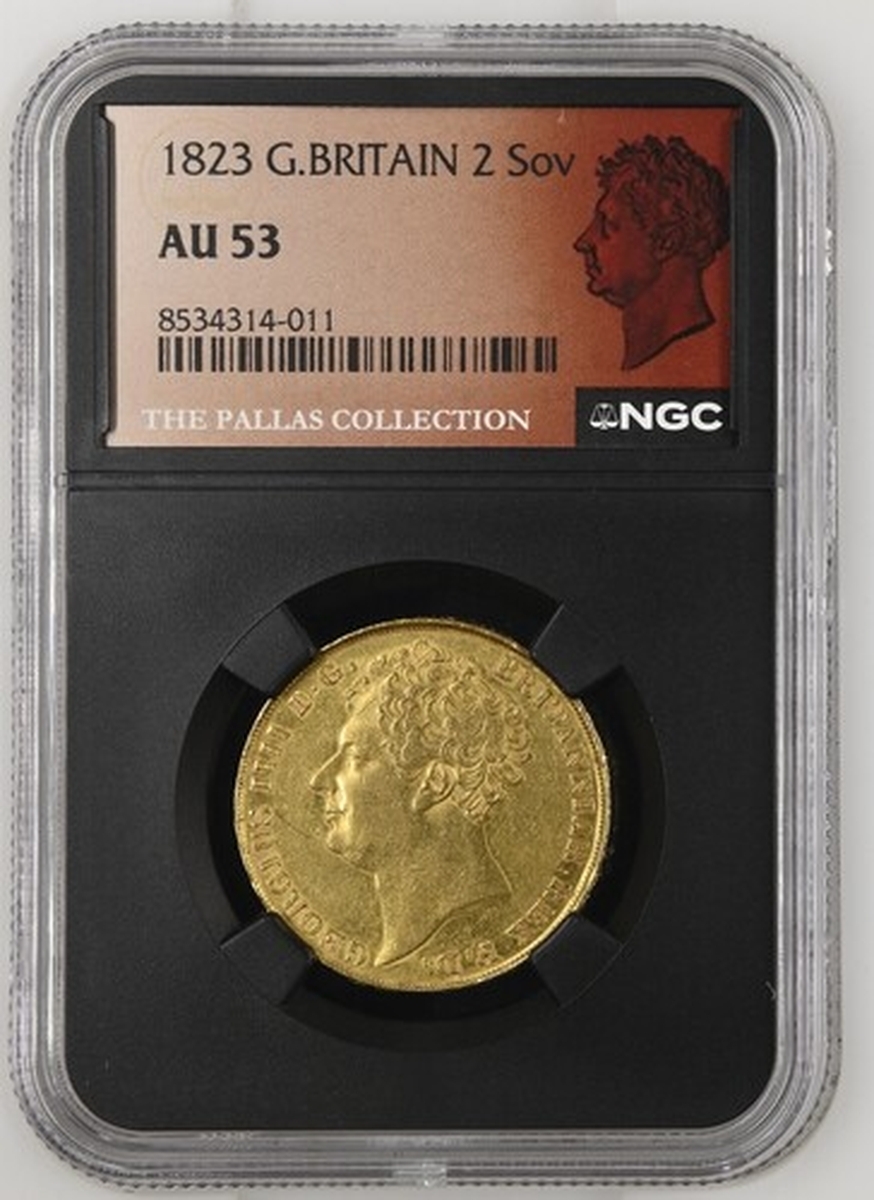 (g) NGC AU53 | George IV (1820-1830), Two-Pounds, 1823 IV, bare head left, rev. St George and Dragon, edge lettered DECUS ET TUTAMEN. ANNO REGNO IV. upwards, 15.940g, 6h (MCE 470; Marsh T6; EGC II, 945; Stratos 171; S.3798), rubbed, but residually lustrous, a really bold very fine, in NGC Black 'Pallas' holder, graded AU53 (Cert. #8534314-011)