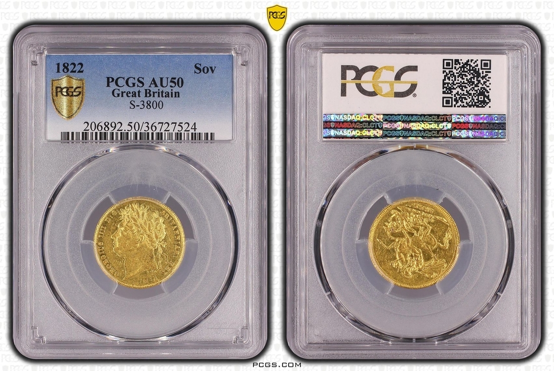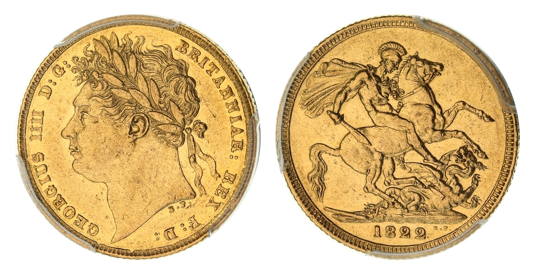 (g) PCGS AU50 | George IV (1820-1830), Sovereign, 1822, Type 1, laureate head left, rev. St. George and Dragon, edge milled, 7h (Marsh 6; MCE 472; EGC II, 961; Bentley 13; S.3800), scattered with light contact marking, nonetheless lustre to reverse field, bold very fine, in PCGS holder, graded AU50 (Cert. #36727524)