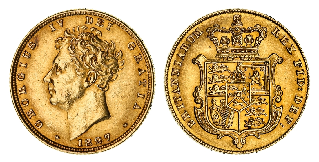 (g) George IV (1820-1830), 'Chantrey's' Sovereign, 1827, Type 2, bare head left, rev. crowned garnished shield, edge milled, 7.98g, 6h (Hill 12; EGC II, 971; cf. Bentley 20; S.3801), light scattering of contact marks, with a residual lustre beneath and a hint of red tone, about extremely fine