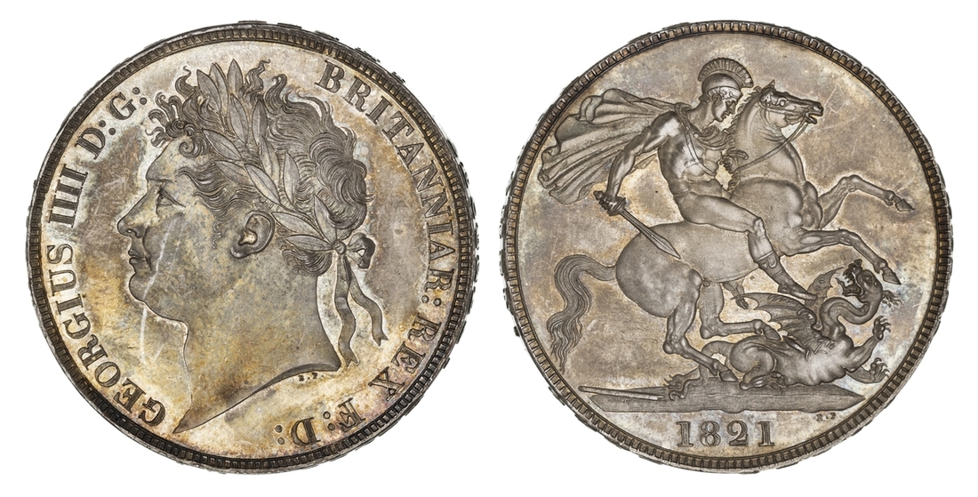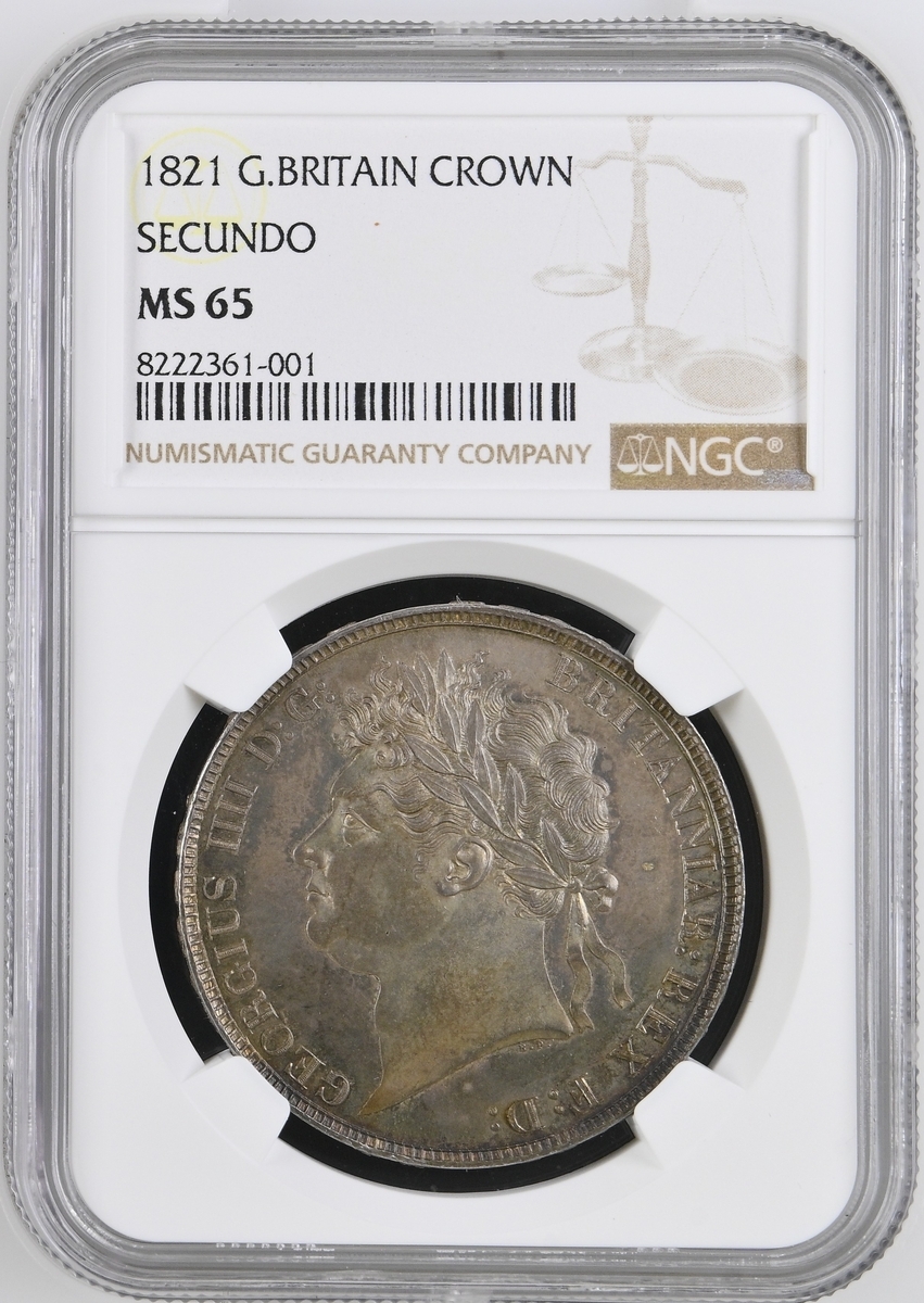 NGC MS65 | George IV (1820-1830), Crown, 1821 SECUNDO, laureate head left, rev. St. George and Dragon, edge lettered downwards, 28.18g, 6h (ESC 246; Bull 2310; S.3805), friction marks on the obverse, otherwise toned, extremely fine, in NGC holder, graded MS65 (Cert. #8222361-001)
