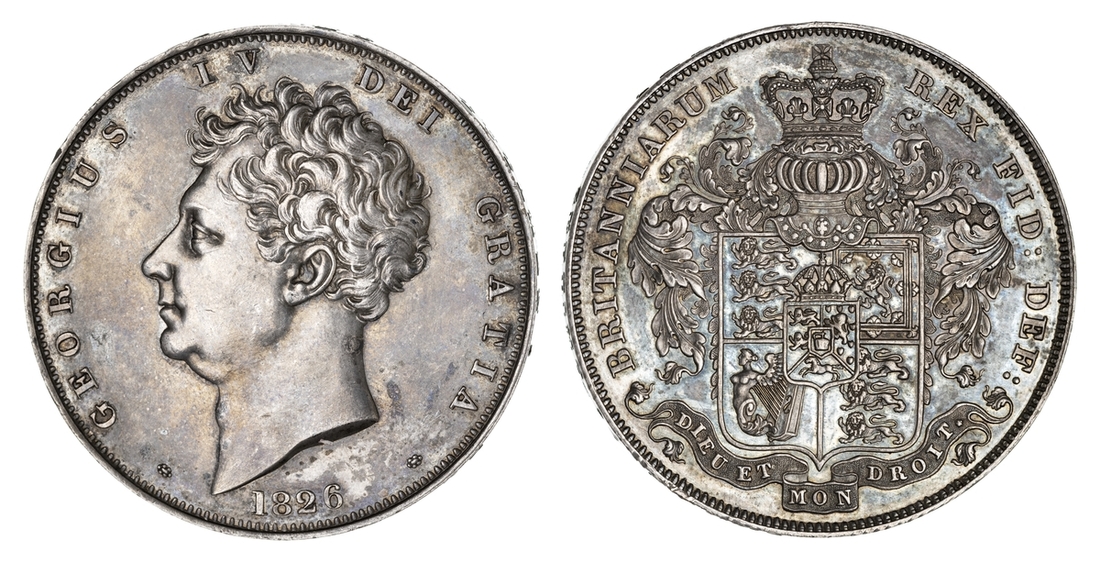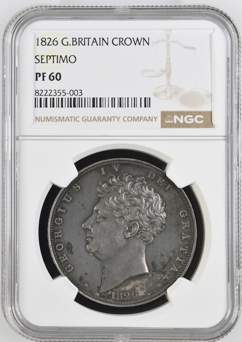 NGC PF60 | George IV (1820-1830), Pattern Proof Crown, 1826 SEPTIMO, by Wyon after Chantrey, bare head left, rev. crowned shield with elaborate garnish, lettered edge downwards, 28.18g, 7h (L&S 28; Bull 2336; ESC 257; S.3806), a few small areas of staining, otherwise brilliant surfaces, deeply toned, uncirculated, in NGC holder, graded PF60 (Cert. #8222355-003)