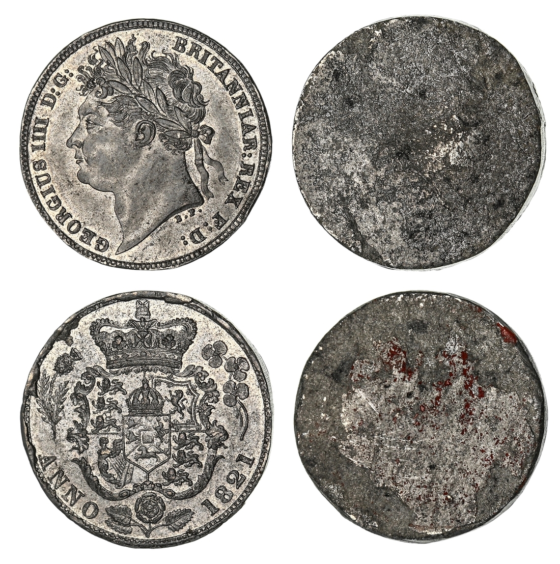 George IV (1820-1830), Uniface Trial Strikings for Sixpence, Obverse and Reverse (2), 1821, laureate head left, rev. crowned garnished shield, 2.64g; 7.15g (Pywell-Phillips 511; Bull 2421; ESC 1654; S.3813), delicately done, extremely fine (2)