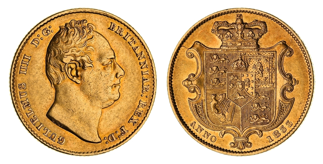 (g) William IV (1830-1837), Sovereign, 1833, second bare head right, rev. crowned shield in mantle, edge milled, 7.98g, 6h (EGC II, 1026; Marsh 18; MCE 491; S.3829B), light bagmarking to obverse and rub to portrait, with some lustre and a rich golden-red tone, good very fine