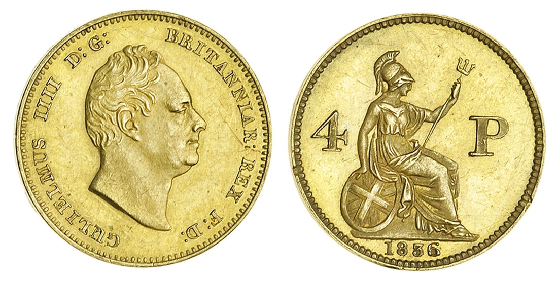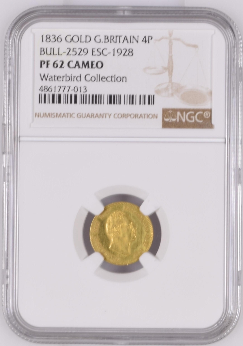 (x) NGC PF62 CAM | *Top Pop* | William IV (1830-1837), Gold Pattern Groat, 1836, bare head right, rev. Britannia seated right dividing value 4-P, date below, edge plain, 3.38g, 12h (ESC 2529 (1928) R5; WR 271), extremely rare, only 5-10 known, in NGC 'Waterbird' holder, graded PF62 CAMEO *Top Pop* (Cert. #4861777-013) [*Single Finest Certified*]