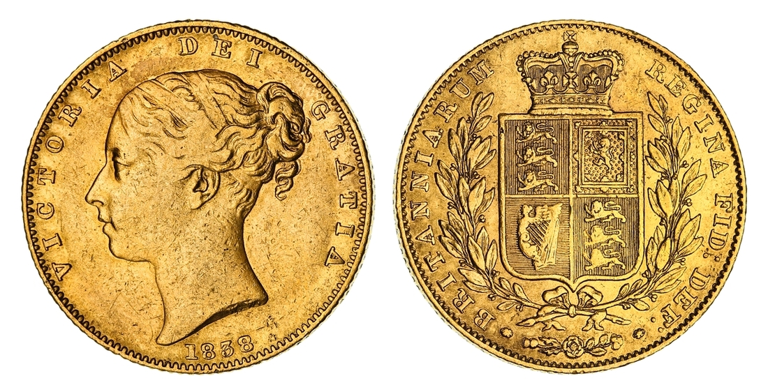 (g) Victoria (1837-1901), 'Shieldback' Sovereign, 1838, first young head left, with two plain fillets, raised W.W. on truncation, rev. 'normal' shield in wreath, edge milled, 7.93g, 6h (EGC II, 1054; Bentley 36; Marsh 22; S.3852), wiped and lightly bagmarked rubbed to the hair, very fine, reverse better, he sought-after first year of issue, rare thus